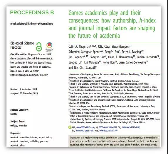 针对学术评价问题,以Chapman 院士、李保国教授领衔的437437必赢国际网址科研团队于2019年12月4日在《英国皇家学会会刊B辑:生物科学》(Proceedings of the Royal Society B-Biological Sciences)发表题目为“学术博弈及其后果:作者排名、h因子和期刊影响因子如何塑造学术研究的未来”一文,探讨比较生物科学和生态进化学科研工作者学术发展的策略和现状,受到学界强烈关注。