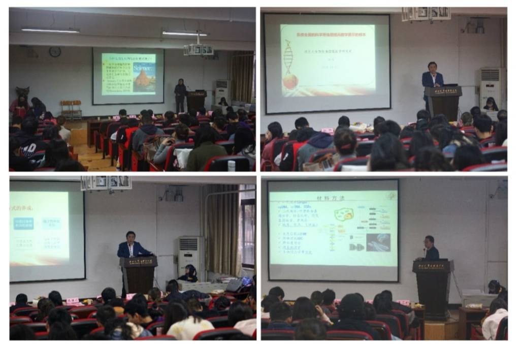 随后进行的“生命科学探索论坛”专家讲座,邀请了学院苏晓红教授、杨进教授、赵鹏教授和谭江丽教授进行了专题报告。专家分别就“白蚁工蚁是怎样转化成生殖蚁的”、“系统全面的科学思维是提高教学质量的跟本”、“胡桃属植物谱系地理学与进化历史研究”以及“诗话昆虫”进行专题报告。期间,学校研究生工作部王全伟老师为研究生做学风与学术道德宣讲报告。