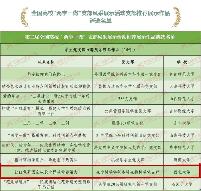 近日,第二届全国高校 “两学一做”支部风采展示活动评比结果揭晓,我院本科生物科学党支部“让红色基因在成长中释放青春活力”获“学生党支部精品作品”荣誉称号。