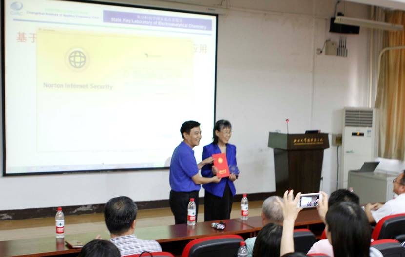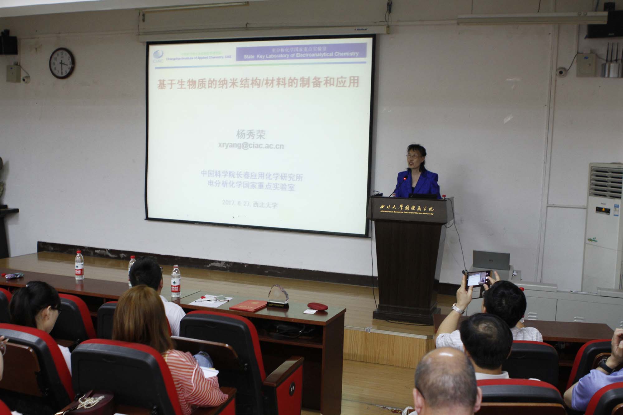 报告会上,杨秀荣院士根据多年研究成果,向与会师生阐明了发展生物质材料的重大意义,她重点介绍了生物质材料在微纳米材料构建及应用研究方面的工作进展:包括基于生物膜构筑的纳米结构及其应用、功能化菌类用于污水净化、真菌类植物衍生碳用于超级电容器、微生物衍生杂原子掺杂碳用于氧还原和超级电容器和利用微波法以葡萄糖为原材料合成碳点及其应用等内容。报告内容新颖,立足分析化学前沿,学术见解深刻独到,讲解细致易懂,使与会师生了解了生物质材料在微纳结构功能材料构建及其在环境能源、分析化学中的研究价值和应用前景,极大拓展了师生的研究思路。