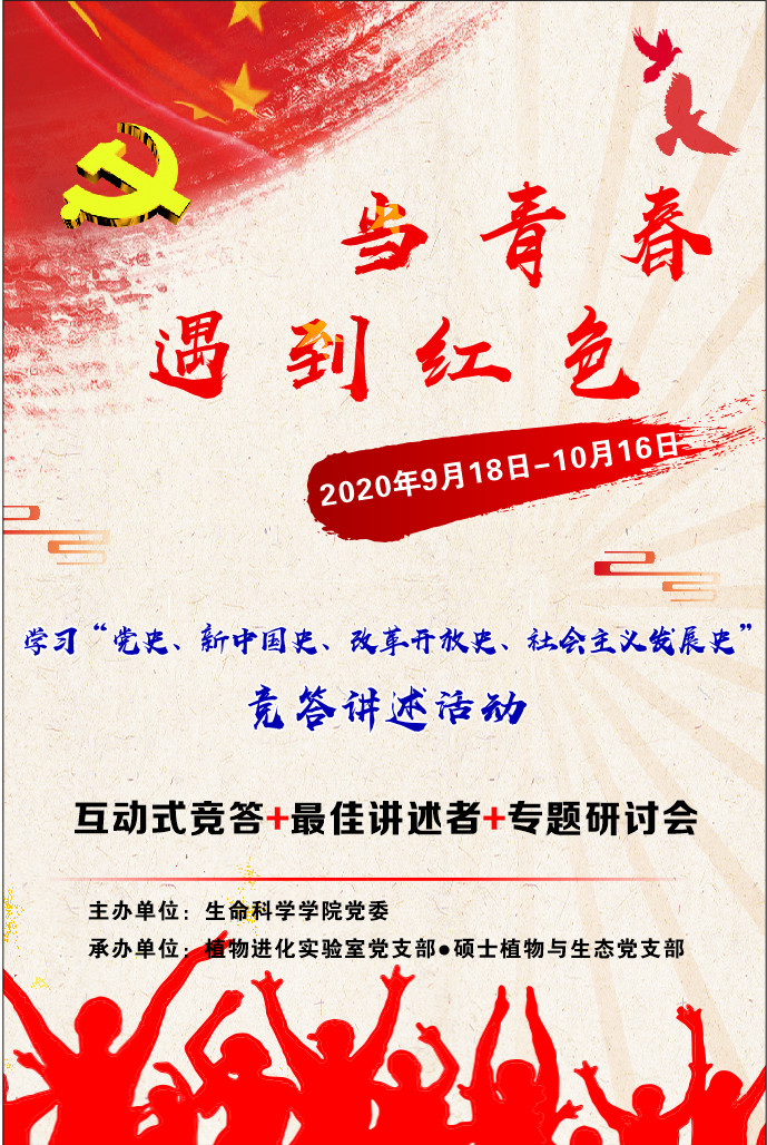 为深入学习贯彻落实习近平总书记关于党史、新中国史、改革开放史、社会主义发展史学习及新冠肺炎疫情防控工作的重要讲话和指示精神,持续深化爱国主义教育,按照学校《关于在全校师生中开展党史、 新中国史、改革开放史、 社会主义发展史学习教育及新冠肺炎疫情防控知识竞答讲述活动的通知》要求,生命科学学院决定面向全院师生组织开展“当青春遇到红色”——学习“党史、 新中国史、改革开放史、 社会主义发展史”竞答讲述活动,现就此次活动相关事项通知如下: