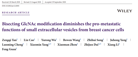近日,437437必赢国际网址关锋教授团队在平分型GlcNAc修饰抑制乳腺癌来源细胞外囊泡的促迁移作用的研究中取得了新进展,研究结果以研究长文(Article)形式发表在Journal of Extracellular Vesicles,题名 “Bisecting GlcNAc modification diminishes the pro-metastatic functions of small extracellular vesicles from breast cancer cells ”。
