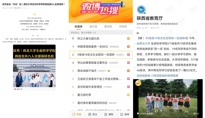 ● 2021年,学院5个宿舍19名学生全部进入“双一流”、“211”高校读研的新闻再次推出,并直接登上微博热搜,被陕西省教育厅等转发。