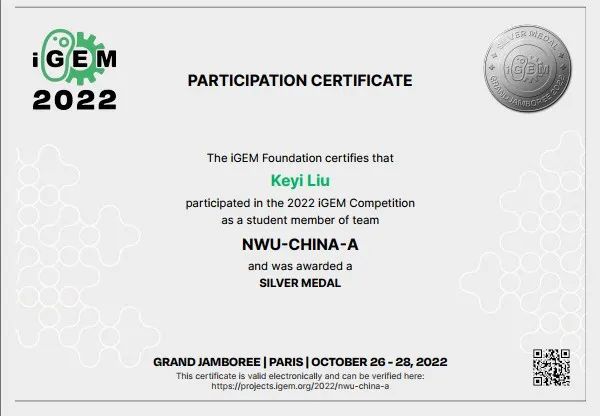(刘珂亦iGEM大赛的获奖证书)