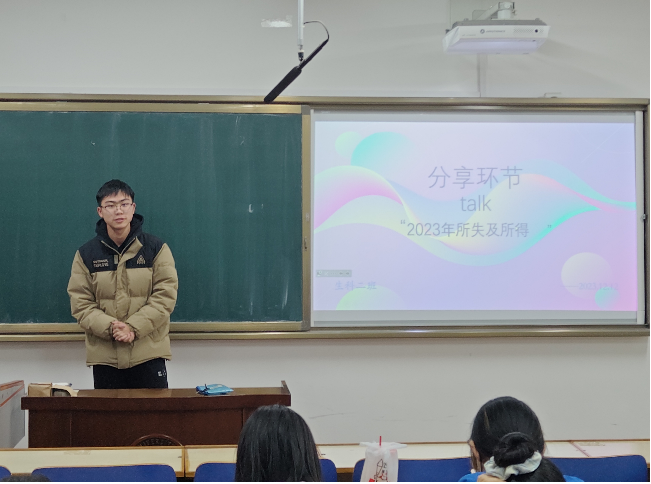 2023年你失去了什么,收获了什么?2023级生科二班以此为主题,在9号教学楼9401教室召开了主题班会,班主任李忠虎老师、余君萍老师及生科二班全体同学参加,赵秀儒同学主持。