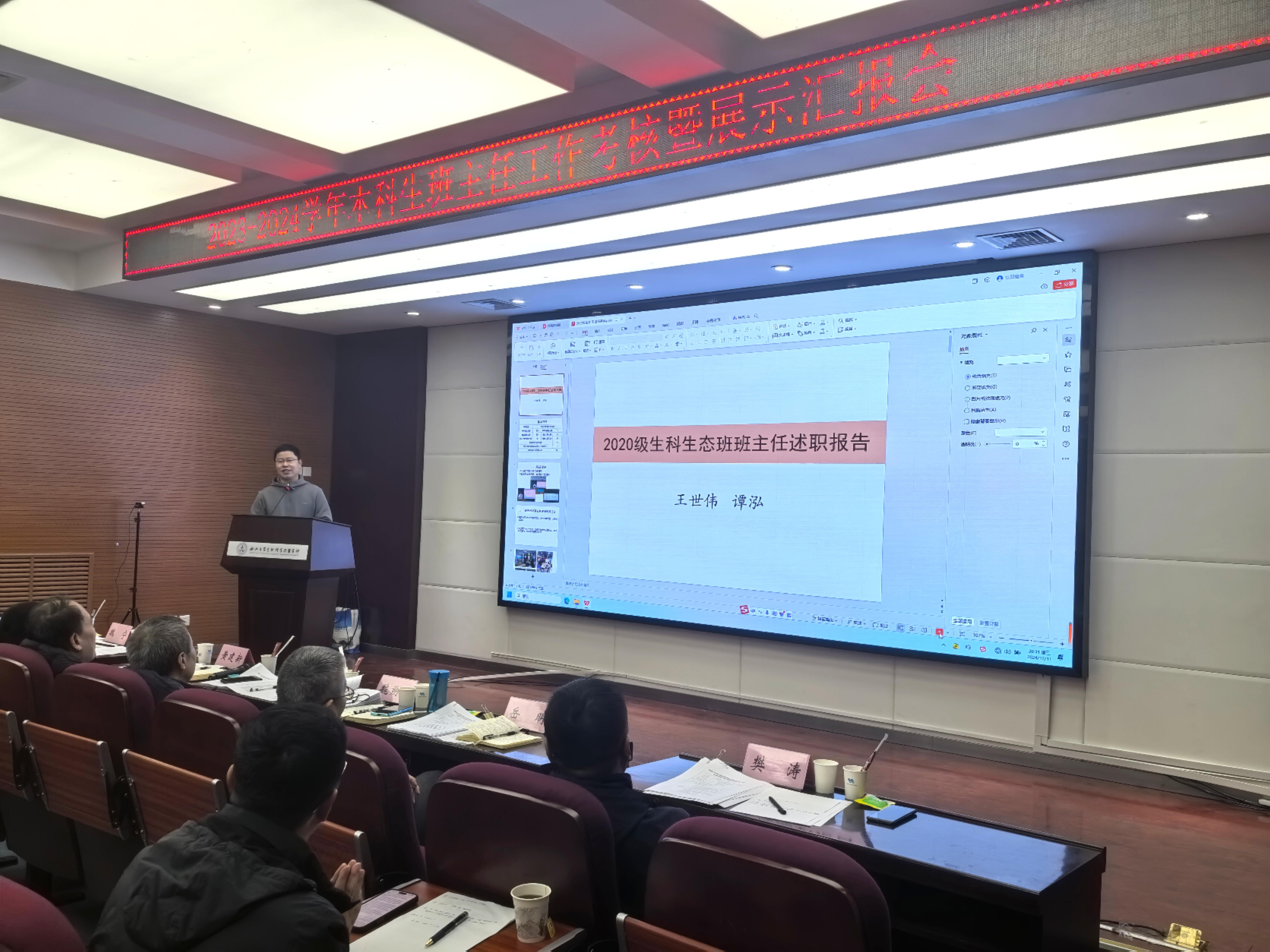 为进一步提升本科生班主任工作质量,培养一支政治强、业务精、纪律严、作风正的班主任队伍,推动学院人才培养工作高质量发展,12月19日上午,学院于博望报告厅召开2023-2024学年本科生班主任工作考核暨展示汇报会。党委书记刘小光,党委副书记魏宁,行政副院长樊涛,教学督导魏朔南、黄建新,生态学学科负责人岳明及原班主任教师代表边六交担任考核评委,2020级-2023级共计22个班级、44名班主任老师参加展示汇报。汇报会由魏宁副书记主持。