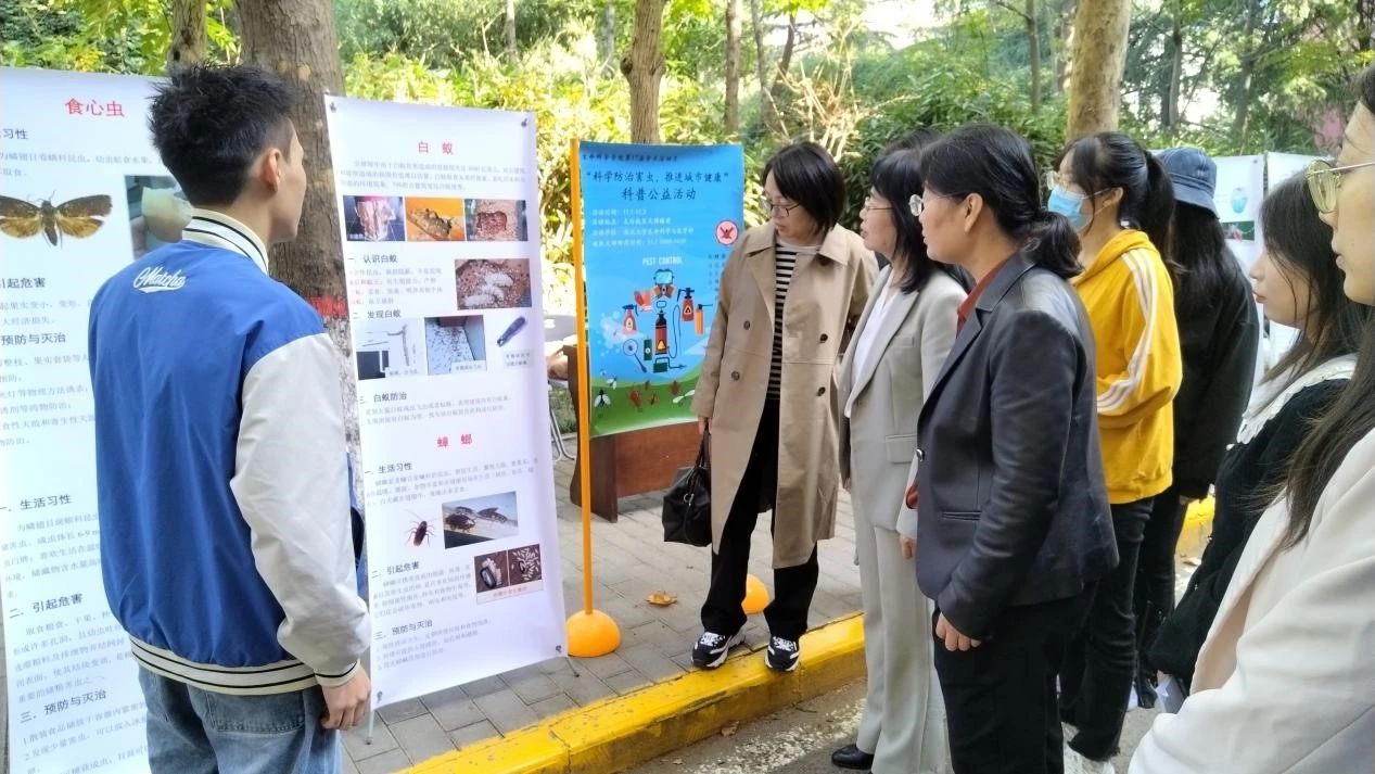 活动期间,昆虫团队师生将精心制作的科普展板放于文博楼前,向来往的师生积极展示、讲解了城市害虫的基本情况与防治方法,吸引了众多感兴趣的老师、同学前来了解。团队5位老师赴现场指导科普情况,对讲解同学的措辞耐心指正,对来往群众提出的问题逐一解答。科普过程中,大多数来往群众提出了如何防治蟑螂的疑惑,讲解师生亲切分享,蟑螂要用专门的蟑螂药或者找专业防治蟑螂的公司进行防治,同时向住处有蟑螂困惑的师生提供了专业研制的蟑螂药。针对大家感兴趣的城市害虫——隐翅虫,讲解同学为他们讲述了隐翅虫的危害和防治办法,分享了如不要用手拍打隐翅虫、野外游玩时要穿长袖长裤、被吸食后立即就医等应对常识。