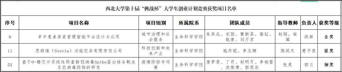 在西北大学第十届“挑战杯”大学生创业计划竞赛中,我院共有52个项目报名参赛,经过专家组评审、线下答辩等比赛环节,我院共有7个项目入围校赛决赛,其中3个项目作品获奖,其中:1项金奖,1项银奖,1项铜奖。让我们来看一下获奖项目名单吧!