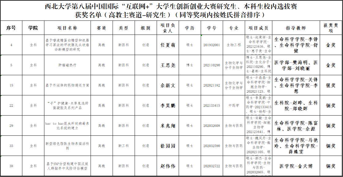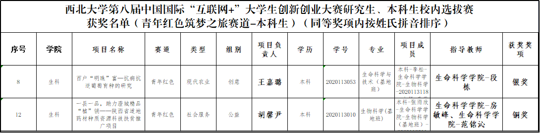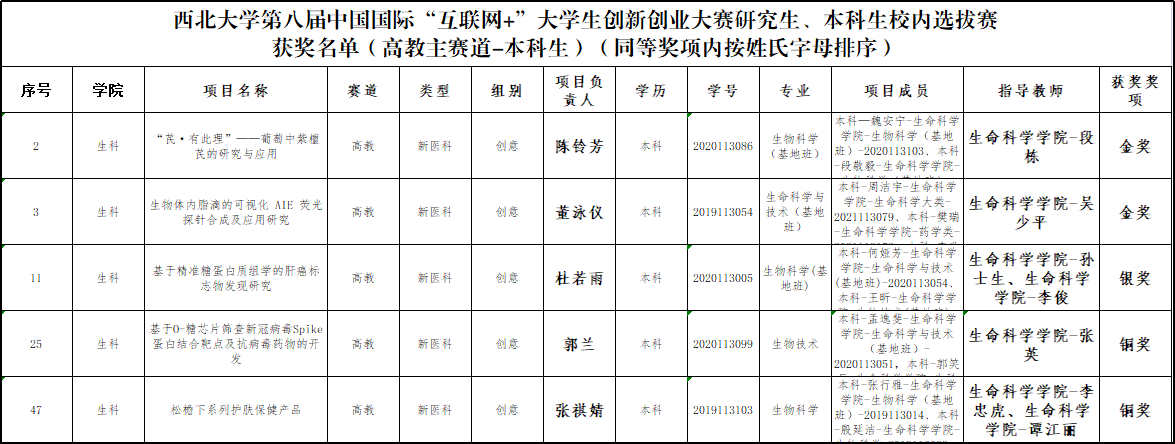 在第八届中国国际“互联网+”大学生创新创业大赛校内选拔赛中,我院共有45个项目报名参赛,经过专家组评审、线上路演等比赛环节,我院共计14项作品获奖,其中:4项金奖,3项银奖,7项铜奖。让我们一起来看下获奖项目名单吧!
