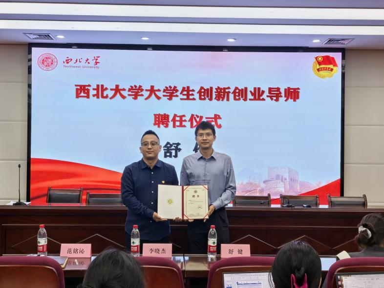 宣讲会上,首先由李晓杰老师给我院舒健老师颁发西北大学大学生创新创业导师聘书。舒老师在2023年的“挑战杯”竞赛中指导研究生完成项目《基于机器学习算法和唾液糖型检测的多器官癌症筛查和定位》,该项目不仅荣获学校金奖,还在陕西省的比赛中摘得了铜奖的佳绩。这一成绩不仅彰显了舒老师卓越的专业指导能力,也充分展示了我院在创新创业教育方面的成果。