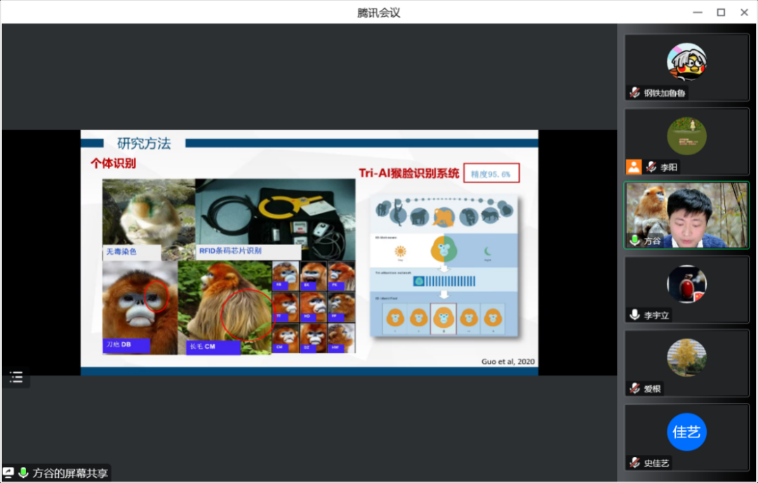 随后,方老师介绍了研究川金丝猴的社会稳定机制和社群维系动力的主要研究方法,方老师所在团队以陕西省国家自然保护区玉皇庙为主要研究地点,再去运用多种技术去进行川金丝猴个体识别,以便于每年观察,时间为3到6个月。