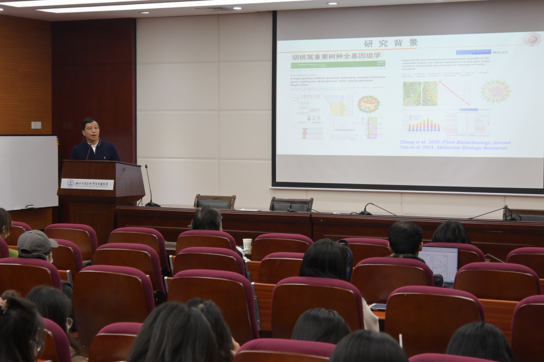 报告会伊始,赵鹏教授介绍了胡桃科植物的研究背景,胡桃的起源,演化历史和驯化基因,讲述了目前的胡桃属植物生物地理间断分布与物种形成模式及生态适应性机制。赵鹏教授团队以重要经济树种胡桃属为模式研究材料,开展生态遗传进化和群体基因组学研究,目的在于推动木本植物驯化机制及资源的可持续利用。