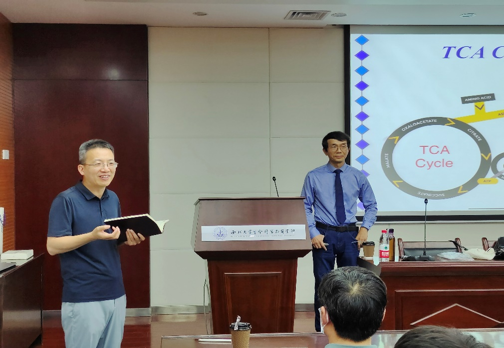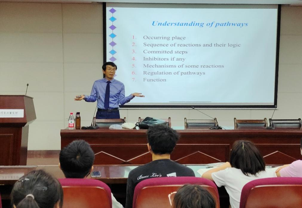 报告伊始,杨荣武教授以“糖酵解”途径为例,讲解如何学习一条代谢途径。杨教授表示应从代谢的发生地、反应顺序、限速步骤、抑制剂、反应机理、调控机制及作用功能七个方面进行学习。随后,杨荣武教授以“糖酵解”和“三羧酸循环”的重要反应为例,展示了如何通过从生化逻辑的角度去理解和掌握一条代谢途径中多个化学反应的组成和顺序,并通过打比喻、随机提问等方式生动地讲解了“糖酵解”和“三羧酸循环”中不易理解的反应原理,从学习方法、学习思路及对内容的细节理解与整体性把握等方面加深了对“如何学习一条代谢途径”的理解。