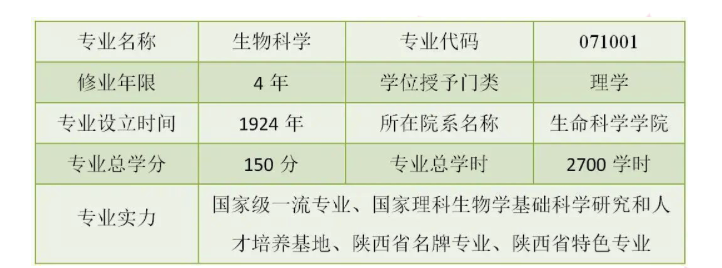 西北大学生物科学专业立足西部,面向全国。依托卓越的师资团队、雄厚的基础教学平台、丰硕的科学研究成果、杰出的专业建设和改革成果,培养高素质生物科学拔尖创新人才。本专业始建于1924年,是我国创建最早的生物学专业之一。90多年的办学历史,雄厚的基础、较高的学术水平、富有成效的人才培养体系和办学特色,走出了生理学家汪堃仁和生物化学家阎隆飞院士,培养了中国科学院植物研究所前所长路安民,华南农业大学原副校长吴鸿,国家杰出青年基金获得者中国科学院植物研究所孔宏智研究员、复旦大学王磊教授、西北大学张志飞教授和刘建妮教授等为代表的多家教学、科研单位技术工作骨干和学术带头人7800余人,是目前西部地区最具有优势和社会影响力的生物学专业之一,现有本科、硕士、博士和博士后人才培养全链条。