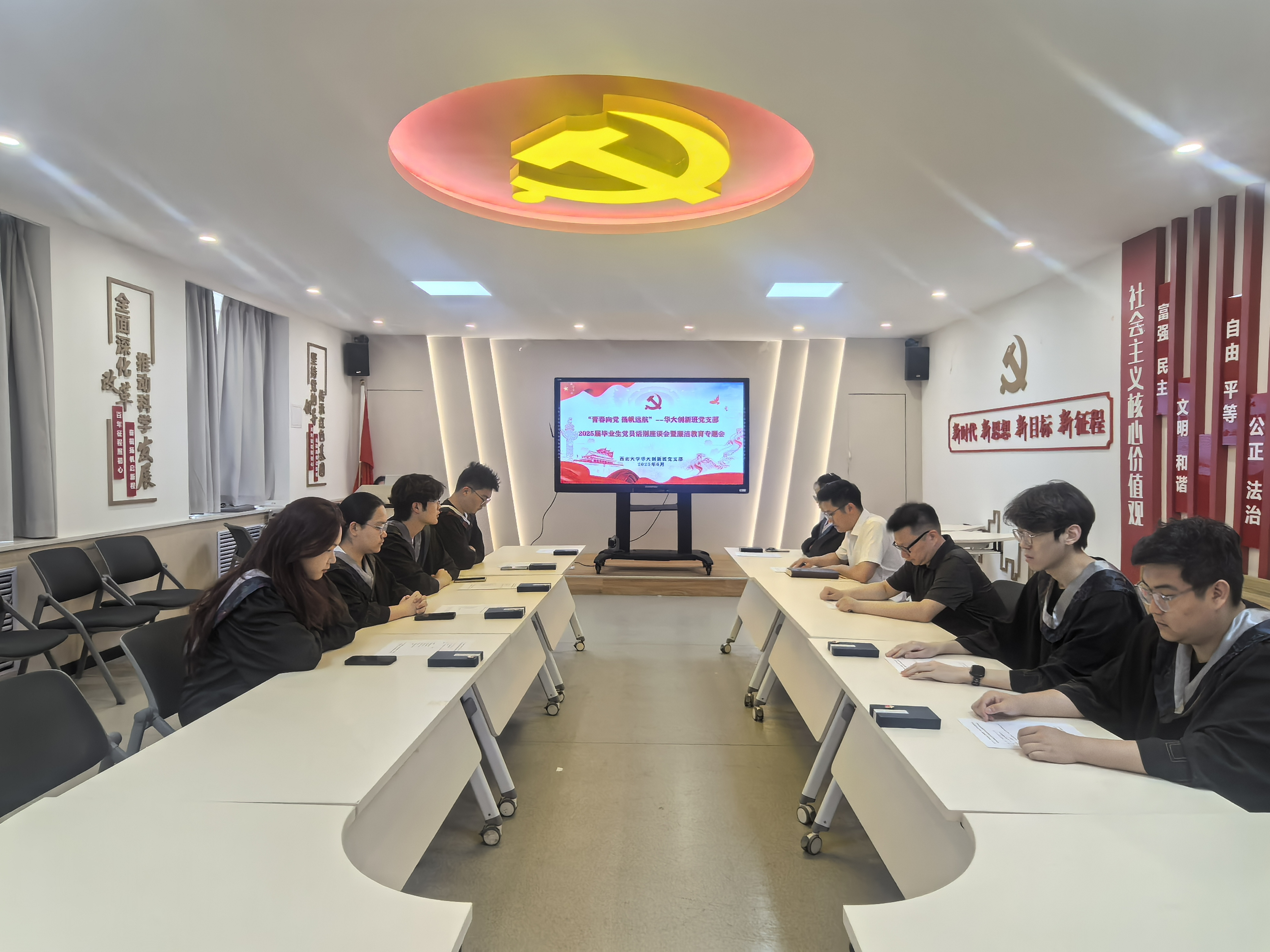 6月22日下午,西北大学华大创新班党支部在太白校区博雅报告厅举行2025届毕业生党员话别座谈会暨廉洁教育专题会。本次活动以“青春向党守初心,廉洁启程担使命”为主题,通过庄严的仪式、深刻的廉洁教育和温暖的毕业话别,激励毕业生党员坚定理想信念,在新的征程上永葆党员本色。