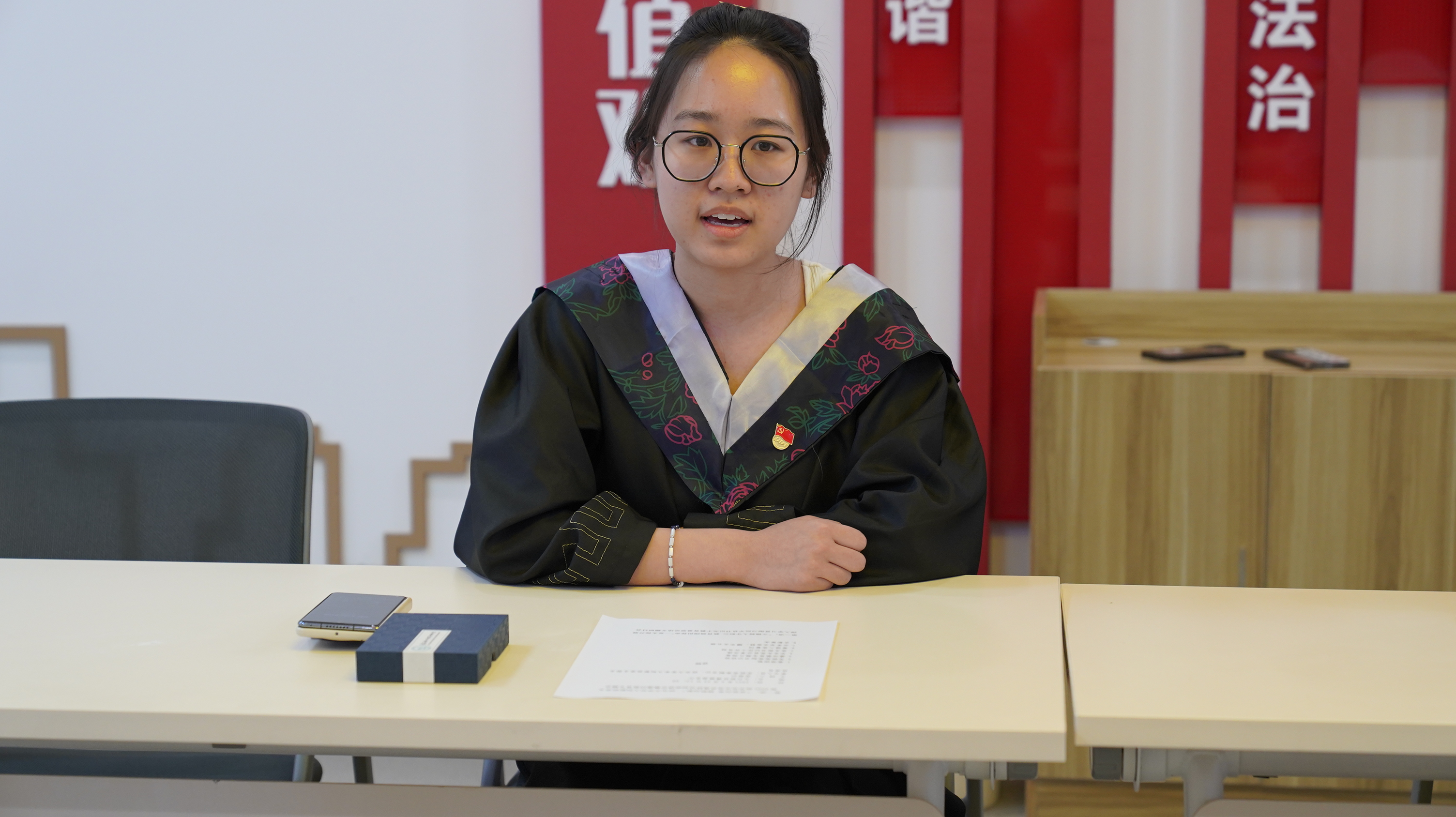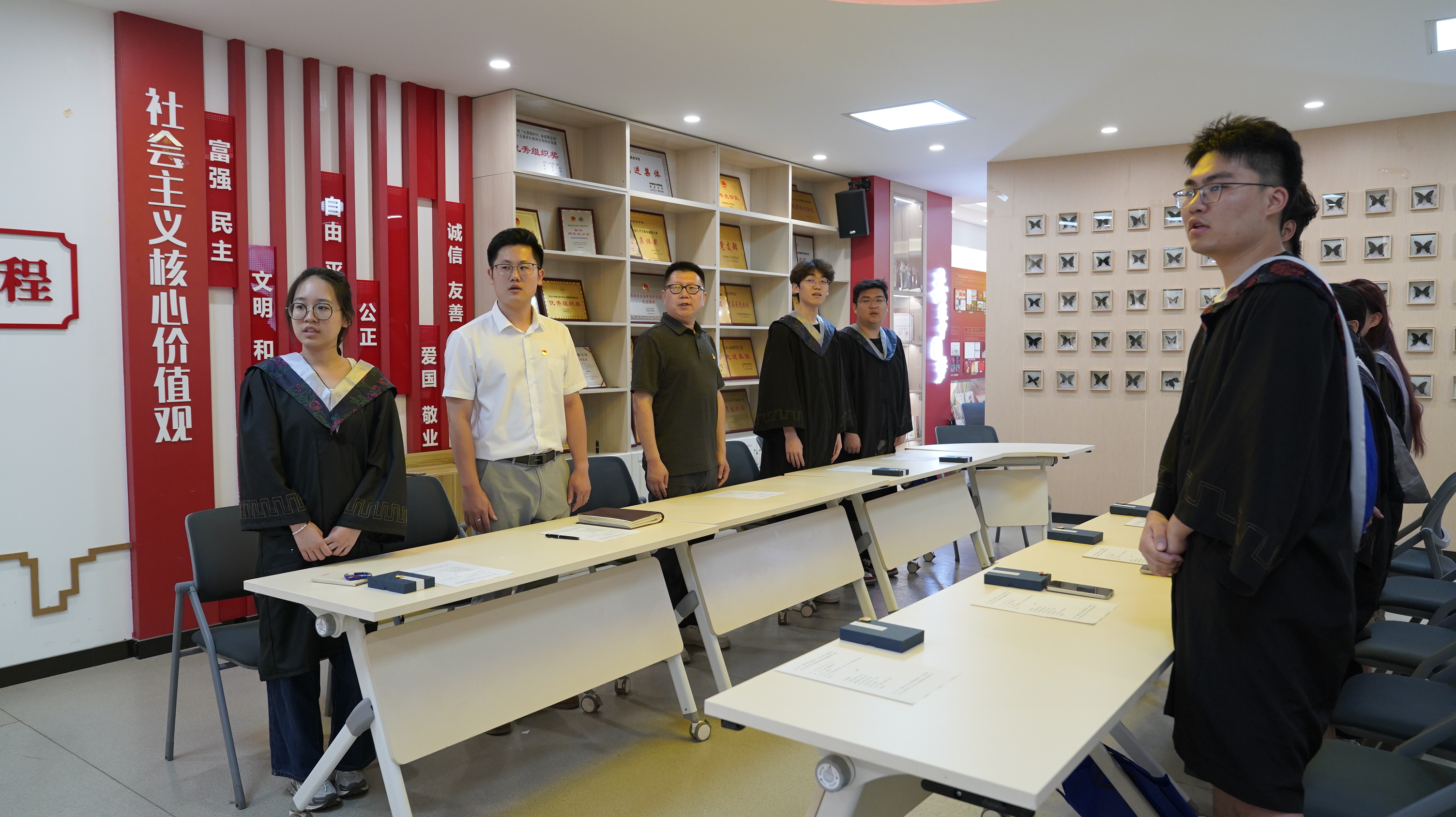 活动在雄壮的国歌奏唱中拉开帷幕。学院党委副书记陈露老师为毕业生党员送上临别寄语,并提出三点要求:做一个正直的人,坚持多读书、勤思考,保持终身学习的习惯;牢记廉洁准则,无论未来从事何种职业,都要坚守底线、严于律己;践行党员责任,在毕业季文明离校,未来在各行各业中发挥先锋模范作用。