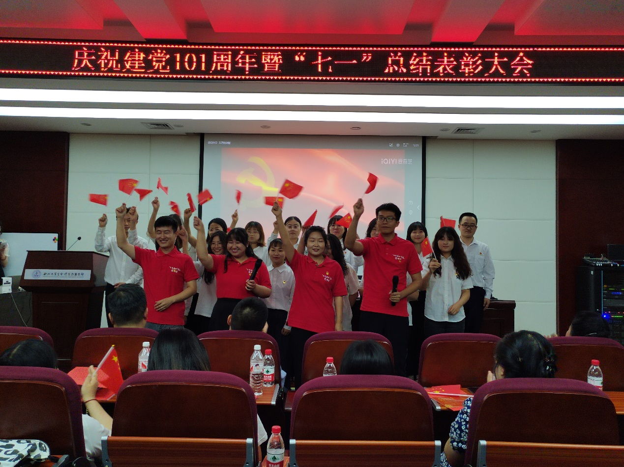 会议最后,教工行政教辅党支部和学生党务工作站分别表演合唱《我和我的祖国》《错位时空》(五四特别版),用高亢嘹亮的歌声再现了中国共产党走过的波澜壮阔的百年历程,唱出对党的无限热爱和礼赞!