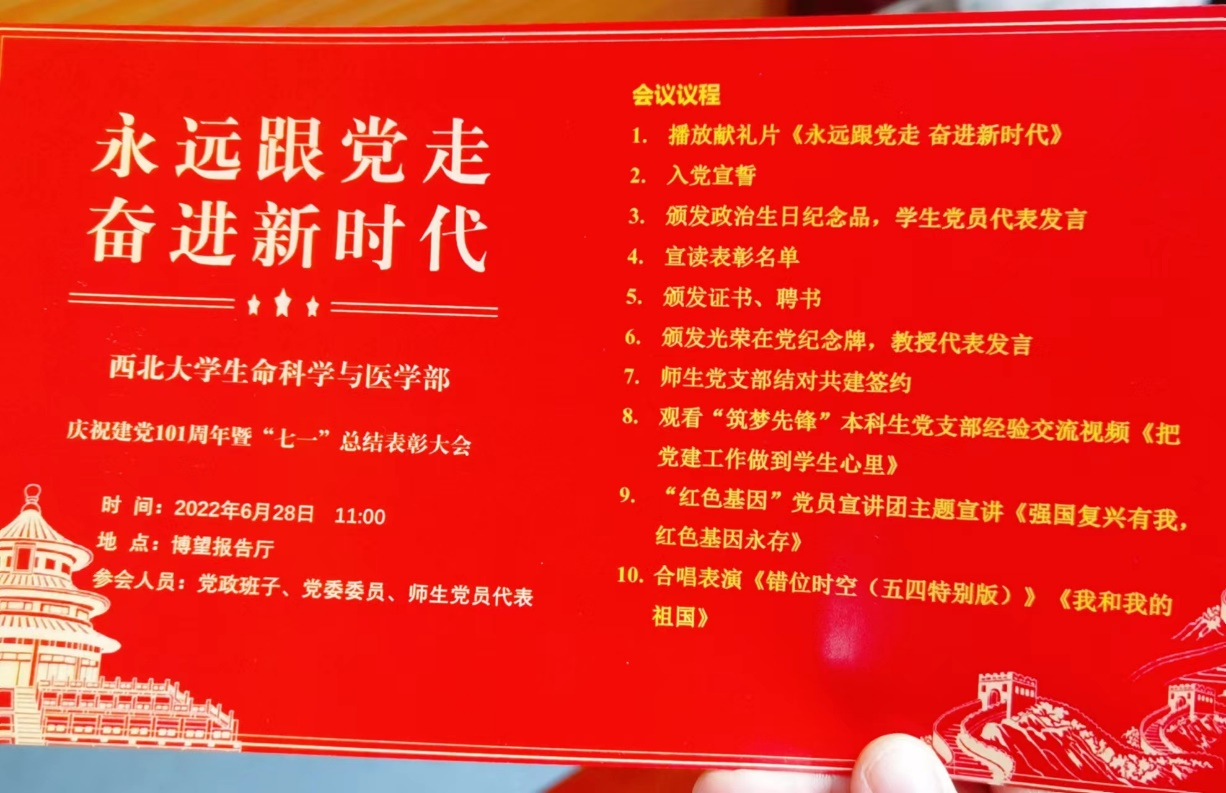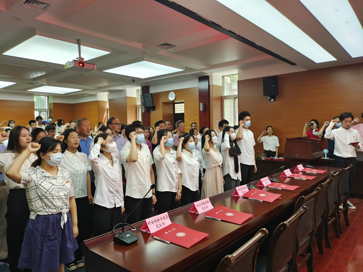 会议在庄严的国歌声中拉开帷幕,与会人员共同观看献礼片《永远跟党走 奋进新时代》,在学生党员代表李析洋的领誓下,新党员进行入党宣誓,老党员重温入党誓词。