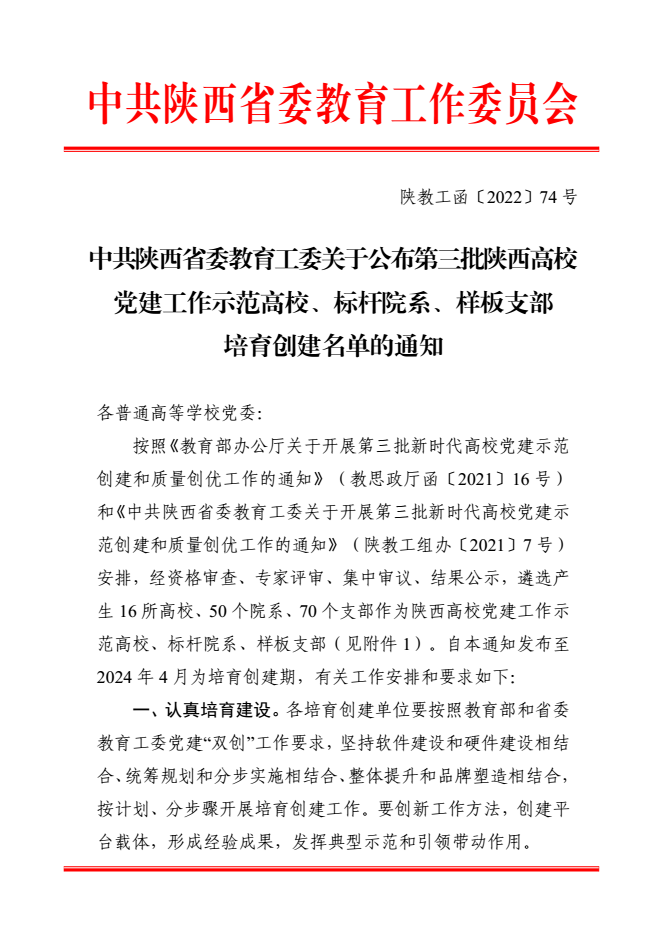 近日,中共陕西省委教育工委印发《关于公布第三批陕西高校党建工作示范高校、 标杆院系、 样板支部培育创建名单的通知》,我院入选第三批陕西高校党建工作标杆院系培育创建单位。