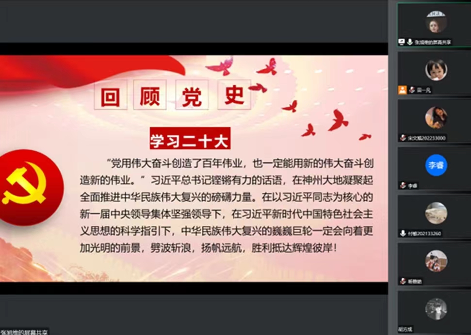 11月5日,硕士生物工程第一党支部线上开展“学党史忆初心,明校史担使命”主题党日活动,通过学习党史、回顾校史、学习榜样三个环节来学习宣传贯彻党的二十大精神,结合党史、校史教育推进党的二十大精神真正入脑入心。与会党员纷纷表示,日后将始终保持蓬勃朝气、昂扬斗志,在推进建设社会主义现代化强国的伟大实践中贡献自己的青春力量。接过时代的接力棒,传承学校红色基因,发挥主人翁精神,珍惜年华、求真务实,淬炼青春、踔厉奋发,以优异的表现与成绩向母校120年华诞献礼,庆祝党的二十大胜利召开!