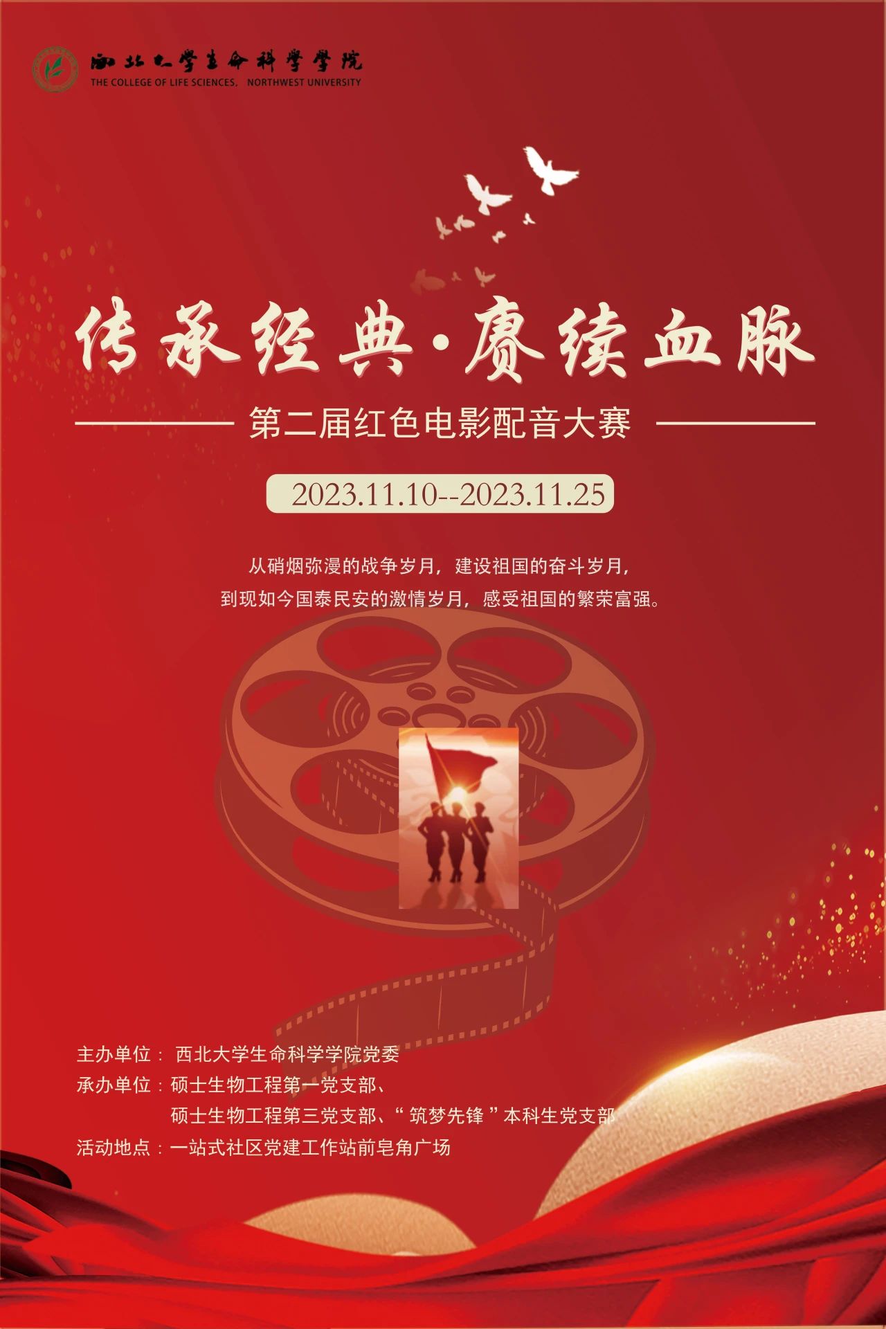 为深入学习贯彻习近平新时代中国特色社会主义思想和党的二十大精神,推进“一站式”学生社区党建工作,教育引导广大师生党员学习感悟革命先辈奋斗历程,弘扬革命传统、传承红色基因,厚植家国情怀。生命科学学院党委决定开展“传承经典·赓续血脉”红色影片配音大赛,现将有关事宜通知如下: