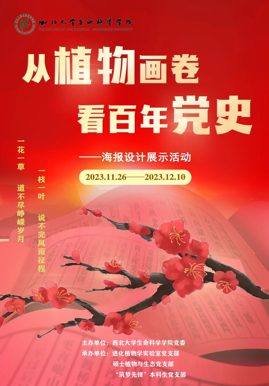 在中国共产党的百年征程中,植物书写了一段段独特的传奇。为深入学习贯彻习近平新时代中国特色社会主义思想和党的二十大精神,教育引导广大师生党员感悟革命先辈奋斗历程,深切体会守护绿水青山的重要意义,生命科学学院党委决定开展“从植物画卷 看百年党史”海报设计展示活动,现将有关事宜通知如下: