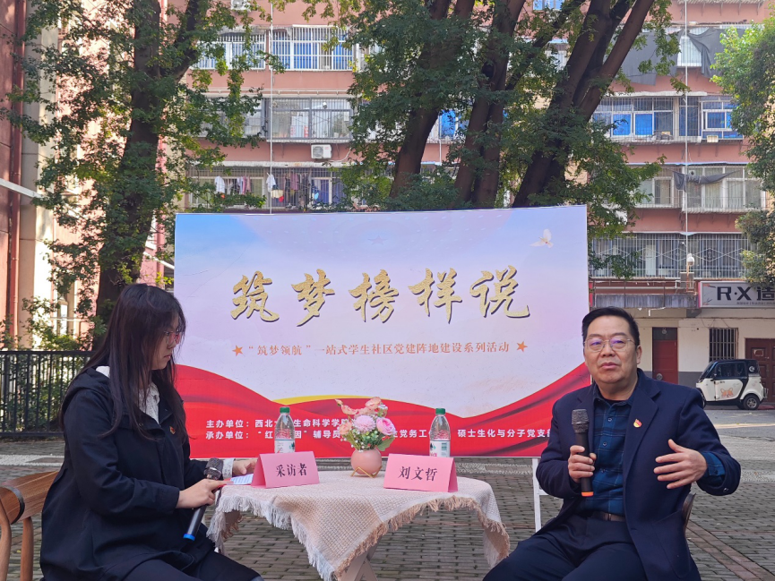为推进一站式学生社区中党建阵地建设,有效发挥先进党员的先锋模范作用,激励广大青年坚定理想信念,发奋成长成才,11 月 5 日上午,由生命科学学院党委主办、“红色基因”辅导员工作室与硕士生化与分子党支部联合承办的一站式学生社区“筑梦榜样说”第三期活动在西北大学太白校区皂角树广场举行。活动邀请到437437必赢国际网址教授、博士生导师刘文哲老师作为访谈嘉宾,学院 30 余名党员代表参加活动。本次活动由“筑梦先锋”本科生党支部书记常雅慧主持。