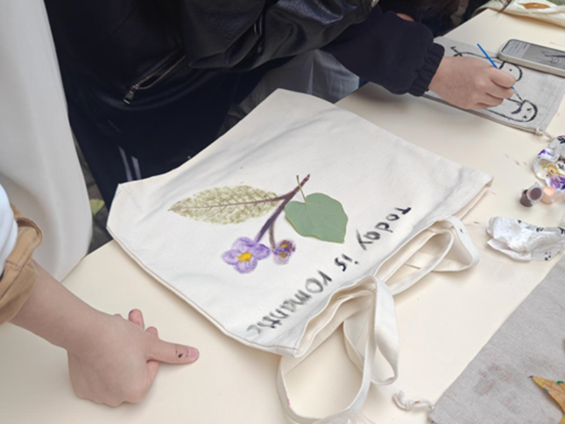 本次活动自11月7日拉开帷幕,共举办两场,为同学们带来了别具一格的文化体验。活动伊始,主持人详细介绍了植物拓染活动所蕴含的悠久文化内涵,将同学们带入了这一古老技艺的神秘世界。随后,同学们热情高涨地投入手工制作环节,通过巧妙的物理敲击手法,将植物汁液与颜料在织物纤维中晕染开来,如同灵动的画笔在白色帆布包、手绢上绘出绚丽多彩的纹理和创意画卷,为植物赋予了全新的艺术生命力。制作完成后,同学们带着满满的成就感走到镜头前,展示自己的植物作品,分享创作灵感以及在制作过程中的欢乐点滴与感悟。此次活动吸引了超过 300 名同学积极参与,通过此次活动,同学们不仅深刻领略了植物拓染这一传统技艺的独特魅力,更在亲身实践中体验了传统文化的深厚底蕴,为校园生活增添了一道独特的文化风景线。