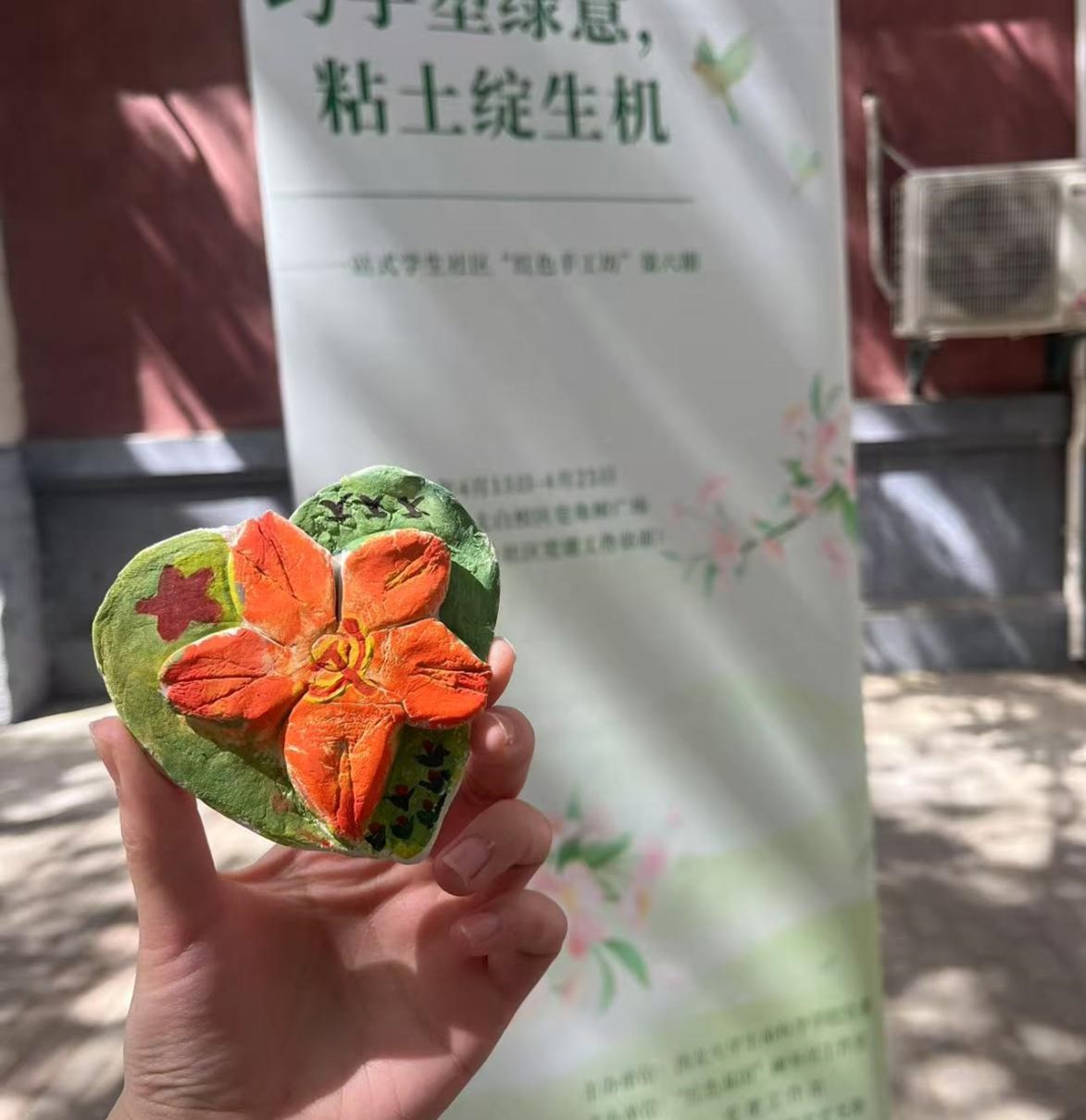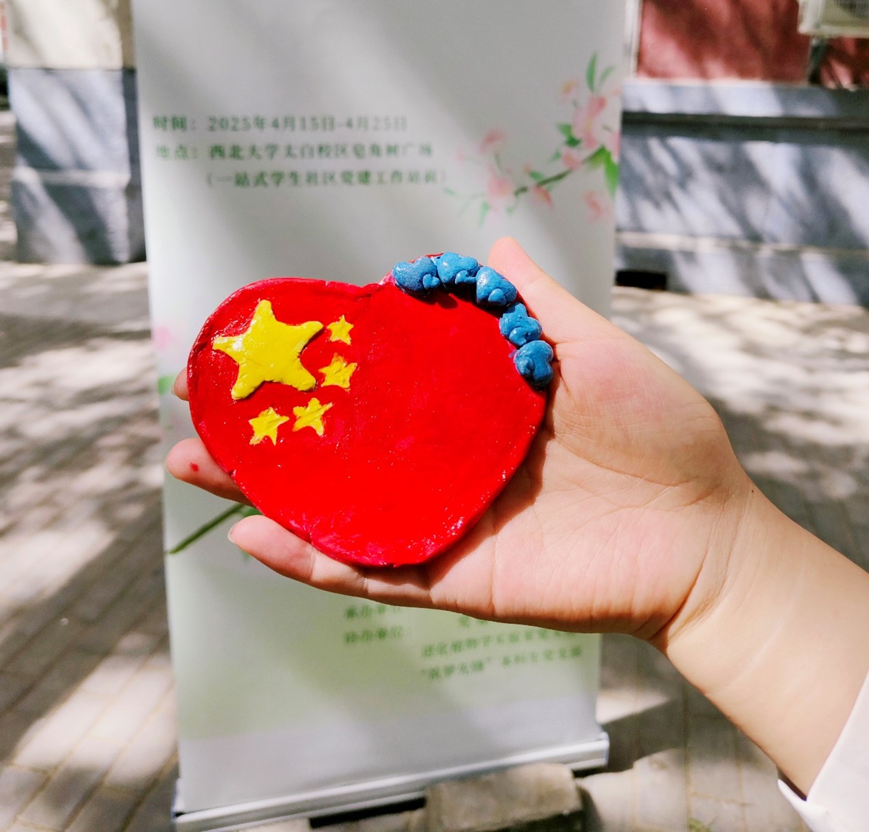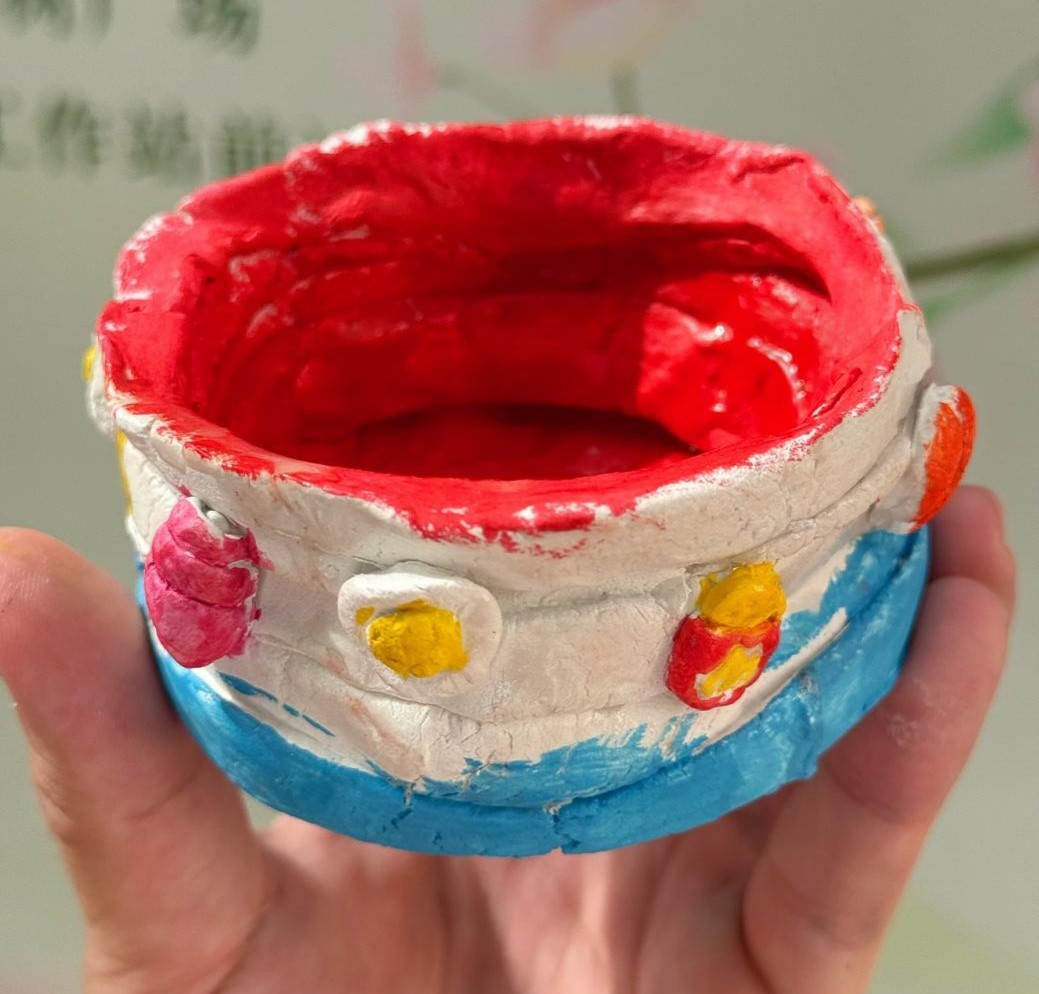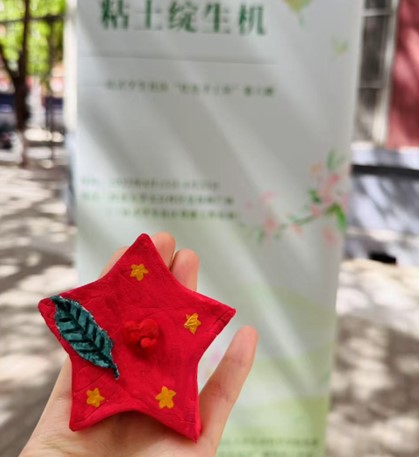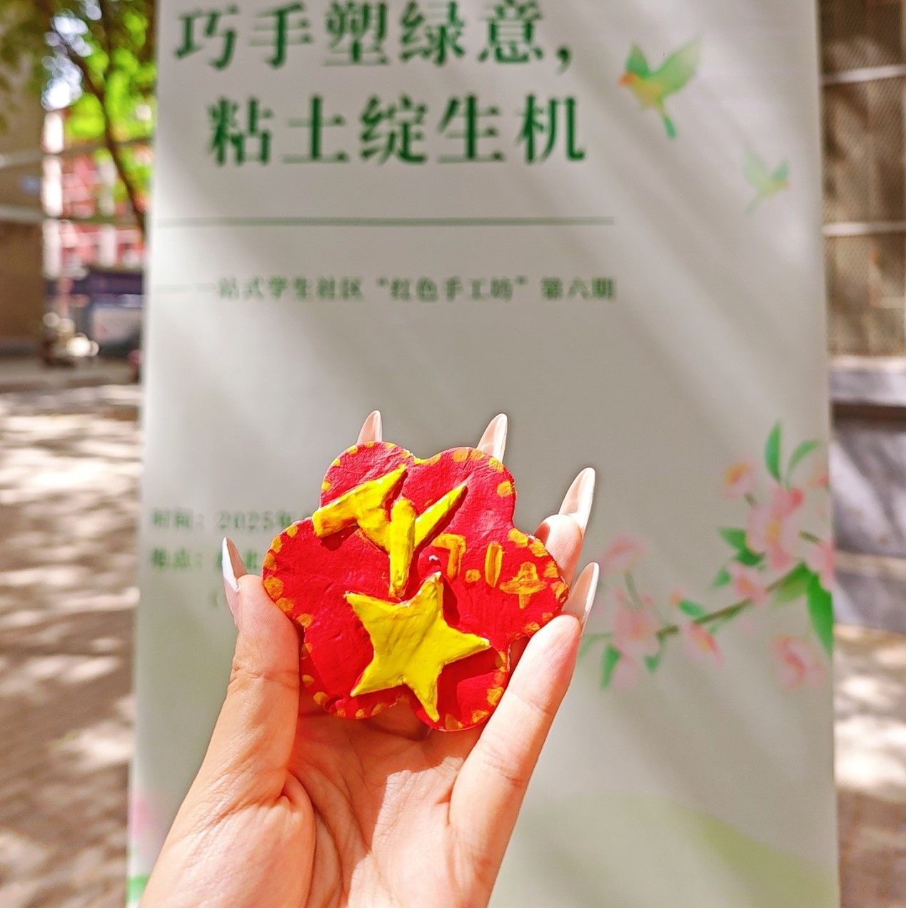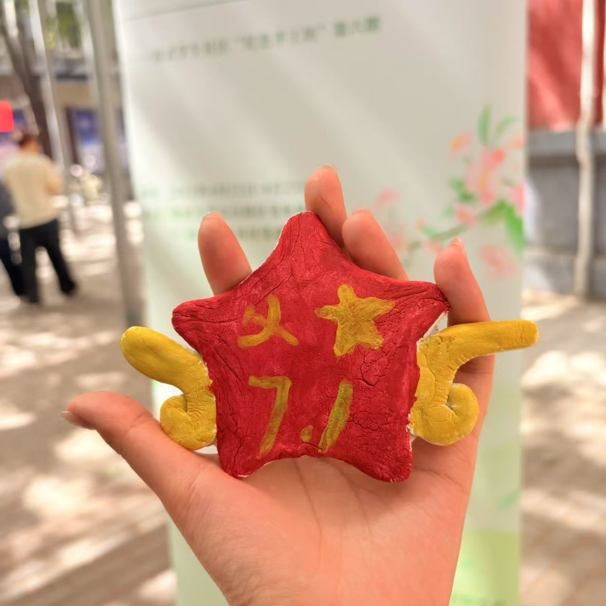 这件粘土作品以鲜艳的红色花朵为主体,象征着蓬勃的生命力与对党的热忱。黄色五角星熠熠生辉,代表着党在我们心中的核心地位,五角星与花朵的结合,寓意着在党的引领下,红色精神如繁花般绽放,传承不息。它展现了对党的忠诚与祝福,激励我们铭记党恩,赓续红色血脉,在新时代中践行使命,让党的光辉永远照耀前行之路。