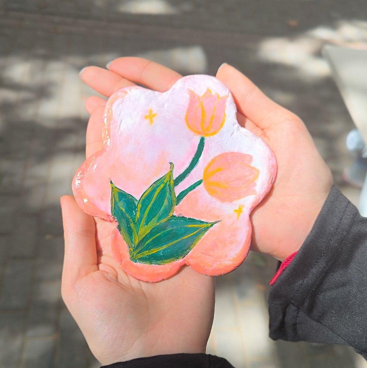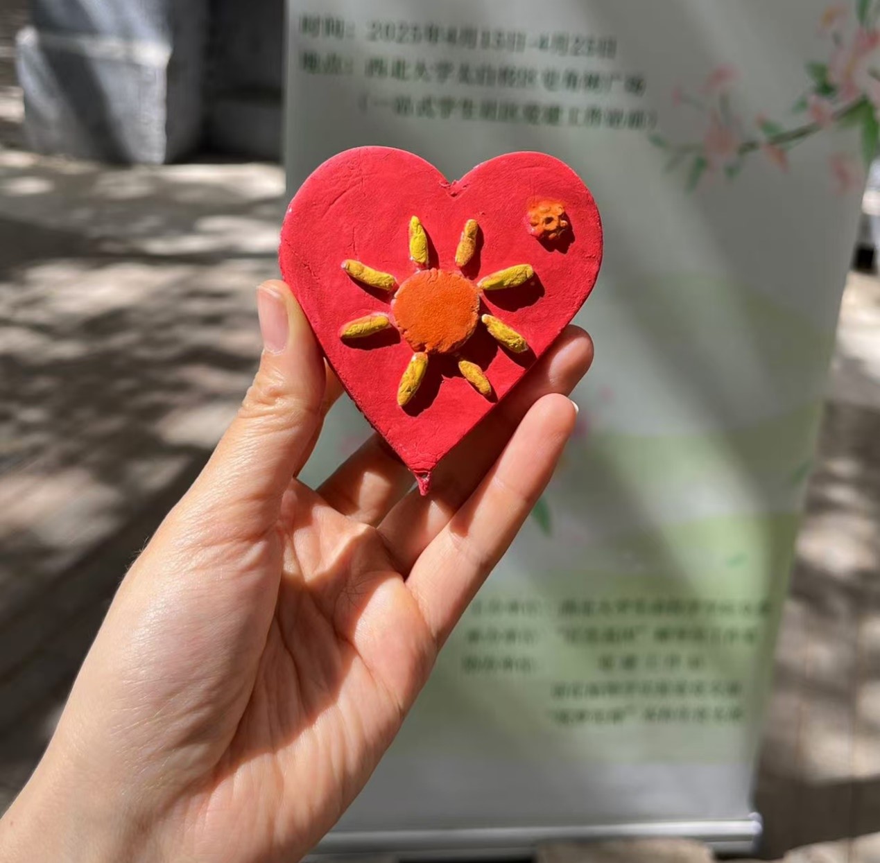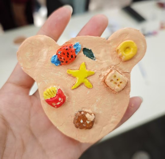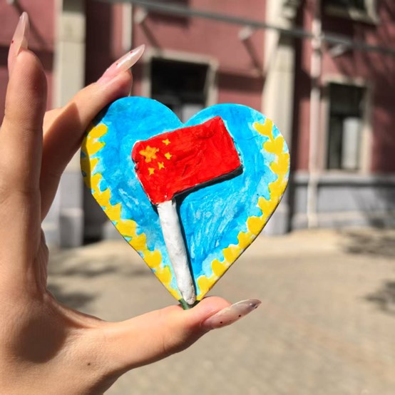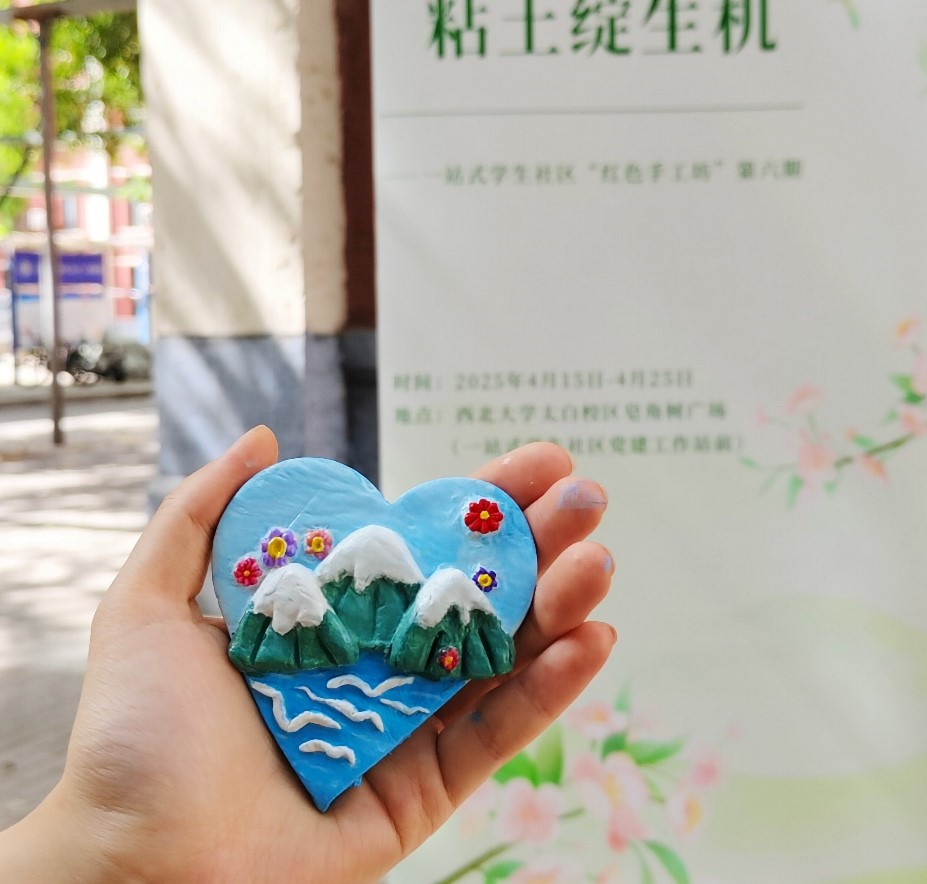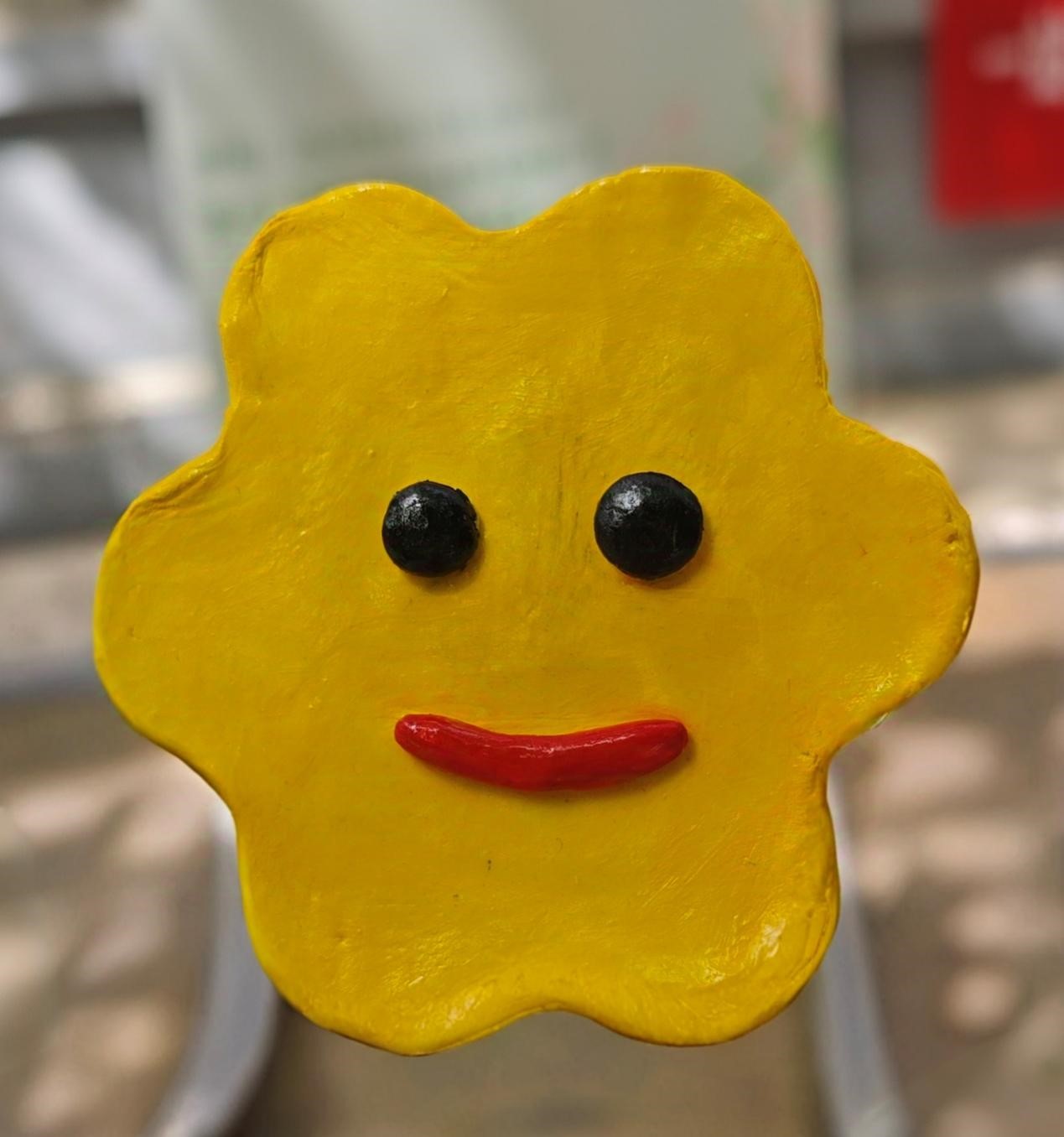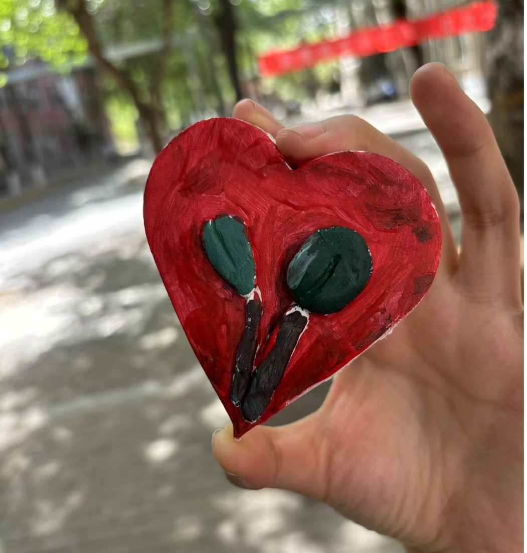 这件粘土作品以鲜艳的红色花朵为主体,象征着蓬勃的生命力与对党的热忱。黄色五角星熠熠生辉,代表着党在我们心中的核心地位,五角星与花朵的结合,寓意着在党的引领下,红色精神如繁花般绽放,传承不息。它展现了对党的忠诚与祝福,激励我们铭记党恩,赓续红色血脉,在新时代中践行使命,让党的光辉永远照耀前行之路。