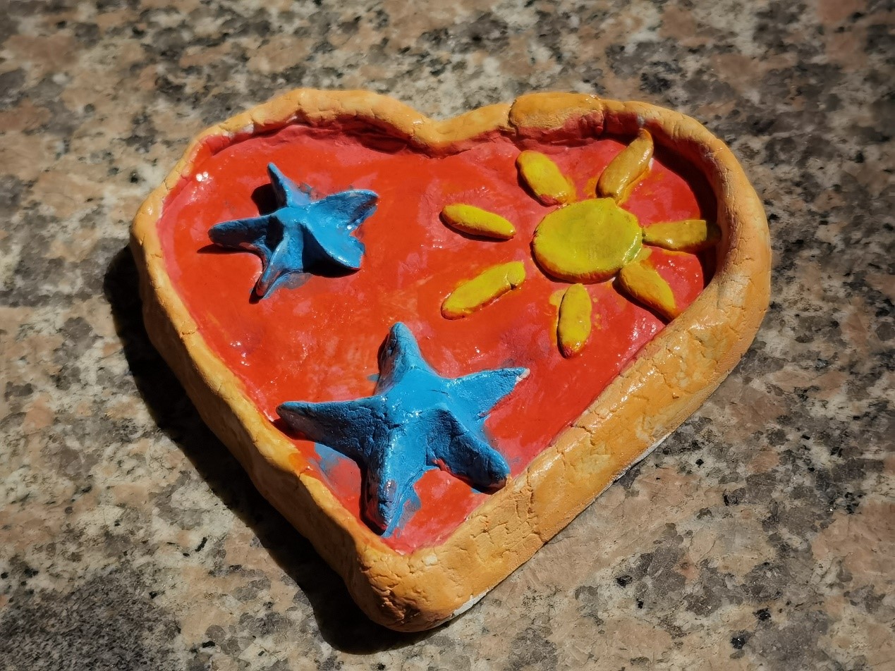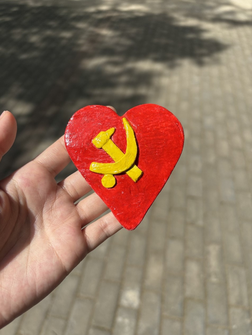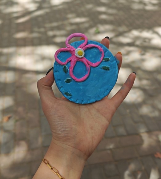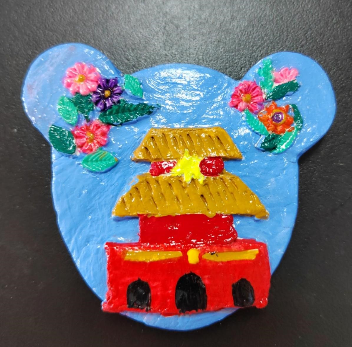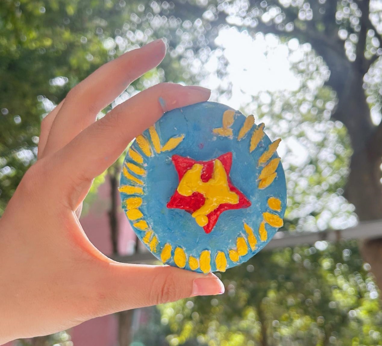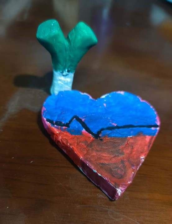 这件粘土作品以鲜艳的红色花朵为主体,象征着蓬勃的生命力与对党的热忱。黄色五角星熠熠生辉,代表着党在我们心中的核心地位,五角星与花朵的结合,寓意着在党的引领下,红色精神如繁花般绽放,传承不息。它展现了对党的忠诚与祝福,激励我们铭记党恩,赓续红色血脉,在新时代中践行使命,让党的光辉永远照耀前行之路。