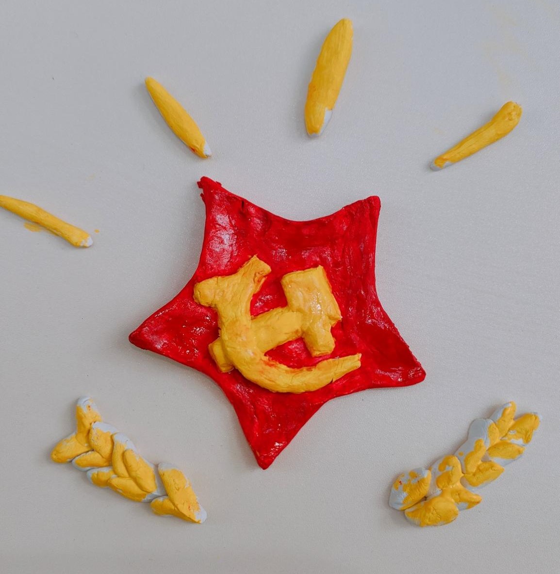 这是用彩泥制作的具有象征意义的图案。主体是红色五角星,上面有黄色的镰刀锤子标志 ,这是共产党的象征,镰刀代表农民阶级,锤子代表工人阶级,二者结合体现工农联盟。周围黄色造型可能是麦穗,象征丰收与富足,也寓意着党对农业发展的重视。整体通过彩泥手工形式,展现出对党的元素的艺术化呈现,表达对党的敬意与拥护,常用于党建主题手工活动、爱国主义教育等场景,以直观且富有创意的方式传递红色文化内涵。
