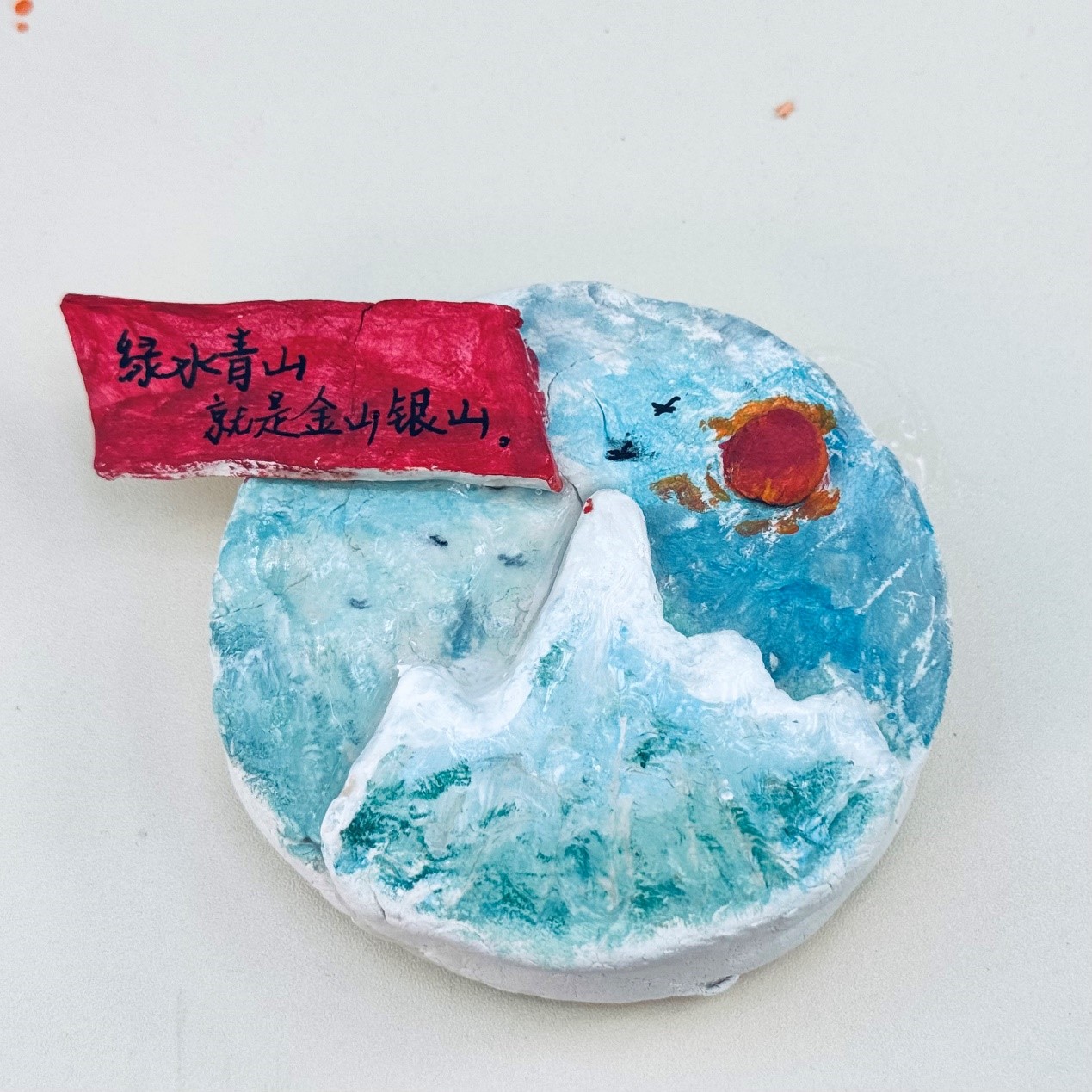 这件泥塑作品以“绿水青山就是金山银山”为创作灵感,通过质朴的陶土塑造出层叠的山峦与蜿蜒的流水,将抽象理念转化为触手可感的立体形态。粗粝的肌理保留了手工痕迹,呼应自然的本真;青绿色点缀其间,象征生态的生机。以泥土这一最原始的媒介,诠释了人与自然共生共荣的永恒主题,让环保理念在厚重与灵动的碰撞中生生不息。