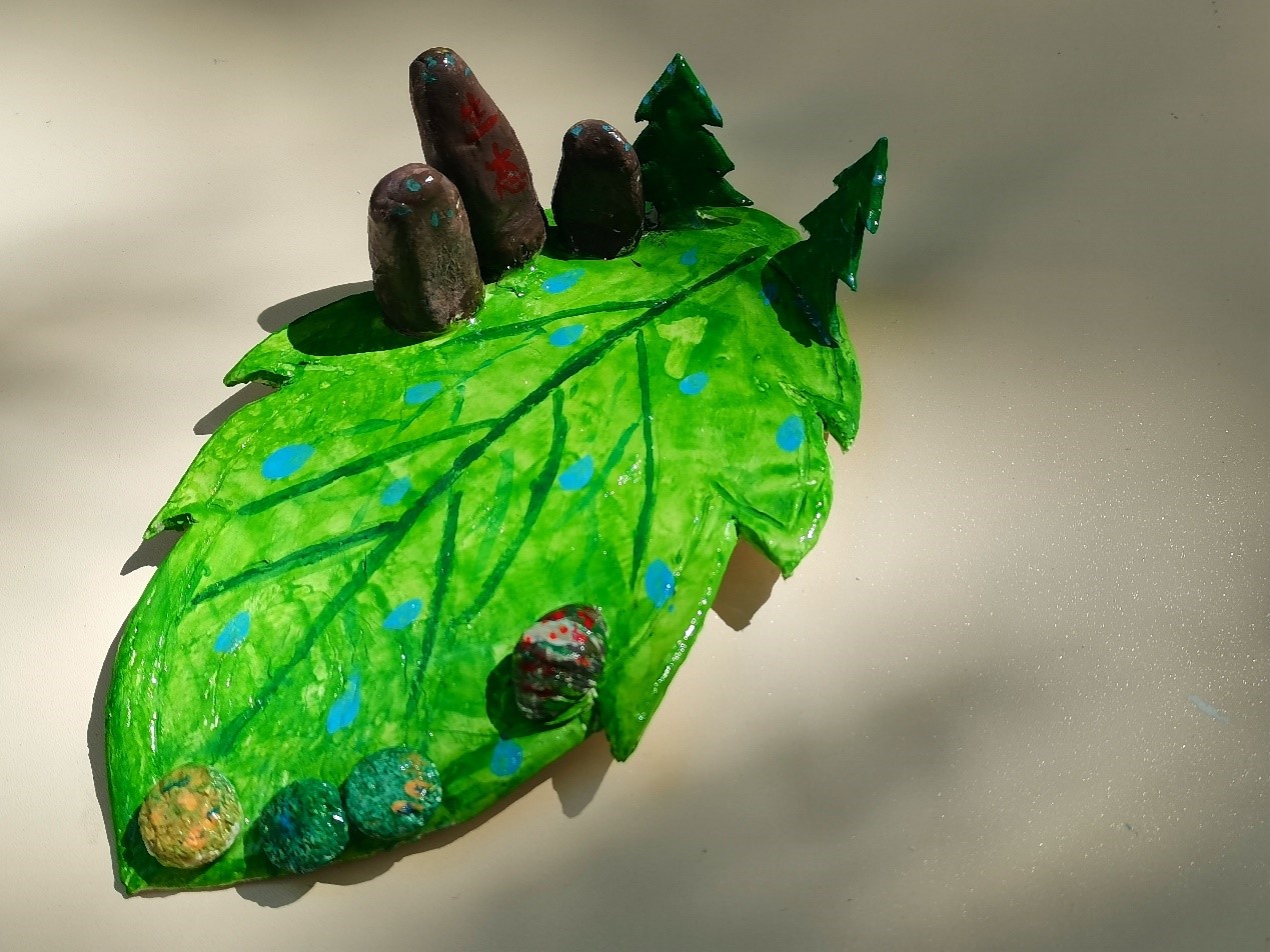 这款生态粘土杯垫,以一片翠绿叶片为基底,生动绘出叶脉纹理,蓝色斑点似露珠点缀,尽显自然灵动。其上错落有致地摆放着用粘土塑成的树木、山石与圆石,仿佛一方微观生态天地。它不仅是实用杯垫,更是生态之美的缩影,提醒人们珍视自然、守护生态。每一处细节都凝聚着对大自然的热爱,将户外的生机与美好巧妙收纳于桌面之上。让我们倾听森林的絮语,珍视这份馈赠!