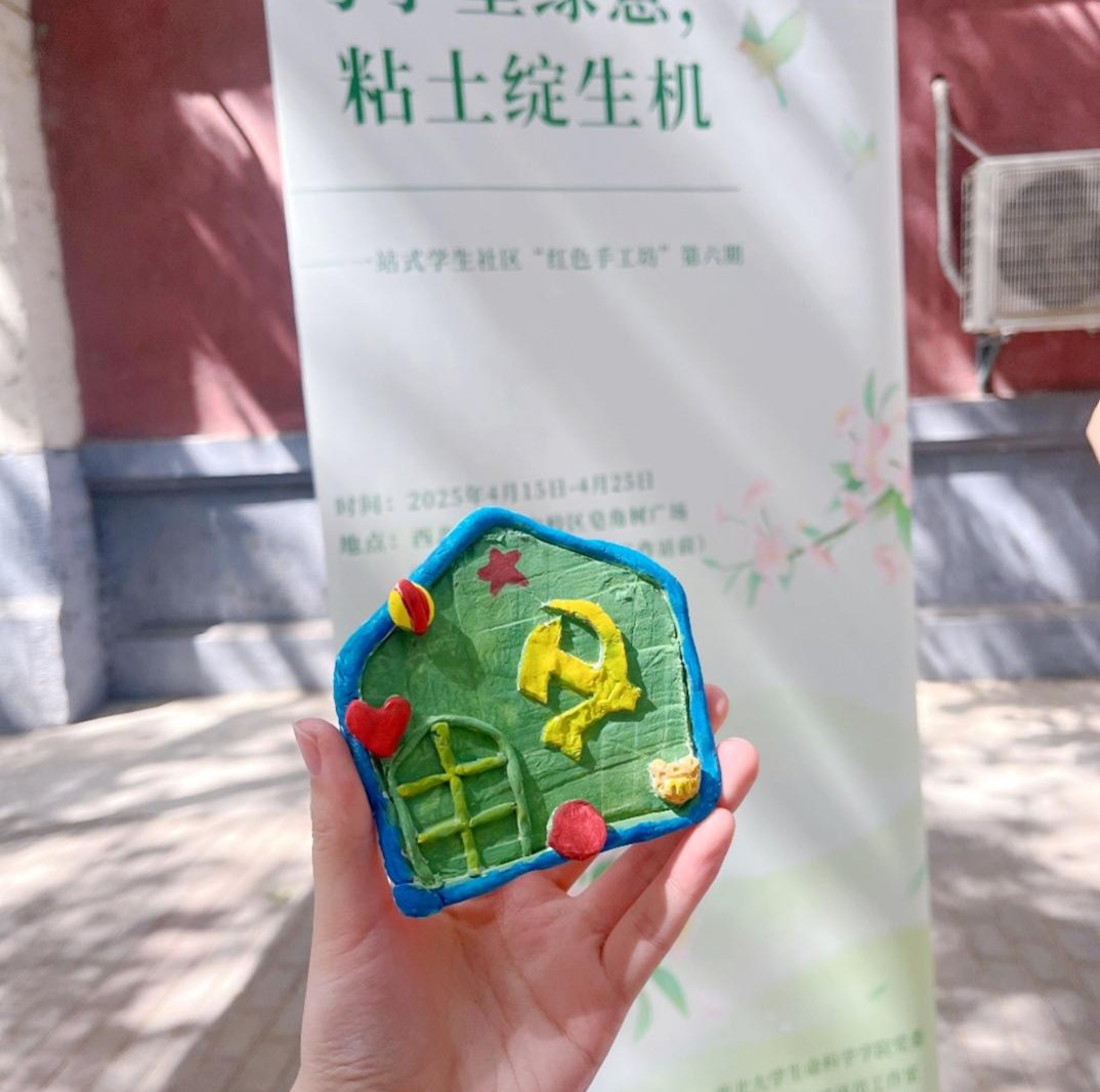 以粘土为媒,匠心为魂,将党的精神与自然之美凝于指尖。以绿意象征新时代生态文明建设的蓬勃生机,舒展的枝叶寓意党引领下的绿色发展之路;初绽的花苞以中国红点染,致敬百年征程中生生不息的信仰之光。传统纹样与党徽元素交织,于方寸间镌刻绿水青山就是金山银山的深意。一抔沃土,既是手作人对红色基因的传承,亦是对党与人民共绘山河锦绣的深情礼赞。