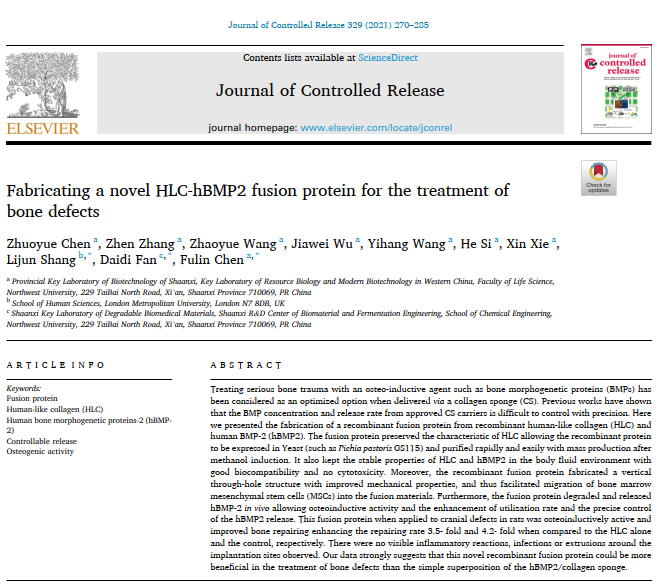 该研究成果以“Fabricating a novel HLC-hBMP2 fusion protein for the treatment of bone defects”为题,2021年1月10日在线发表于Journal of Controlled Release (医学一区Top期刊,IF 7.727 ) DOI:10.1016/j.jconrel.2020.11.058。该研究得到了国家自然科学基金、陕西省特支计划的资助。西北大学青年教师陈卓玥博士为论文第一作者,商立军教授,范代娣教授和陈富林教授为通讯作者。