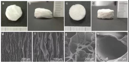 图1.HLC-hBMP2融合蛋白材料(a, b)纯化的HLC和(c, d)HLC-hBMP2支架材料;SEM形貌观察:(e,f) HLC和(g,h) HLC-hBMP2。