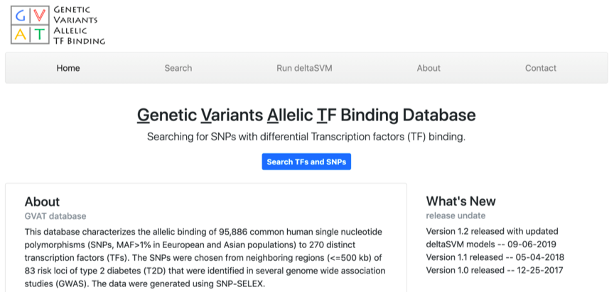 (http://renlab.sdsc.edu/GVATdb/)。研究人员在该网页内输入感兴趣的转录因子名字或者SNP的rsID,便可快速找到与其相互作用的SNP或者转录因子,以及它们之间的量化影响。