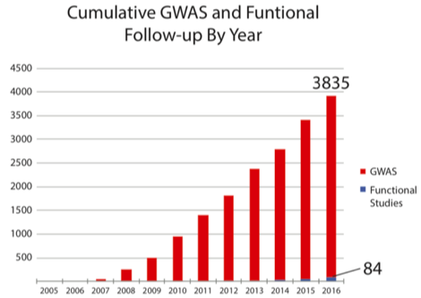 红色表示GWAS发现的位点随着时间推移的增加,蓝色表示对GWAS发现位点的功能研究的积累。
