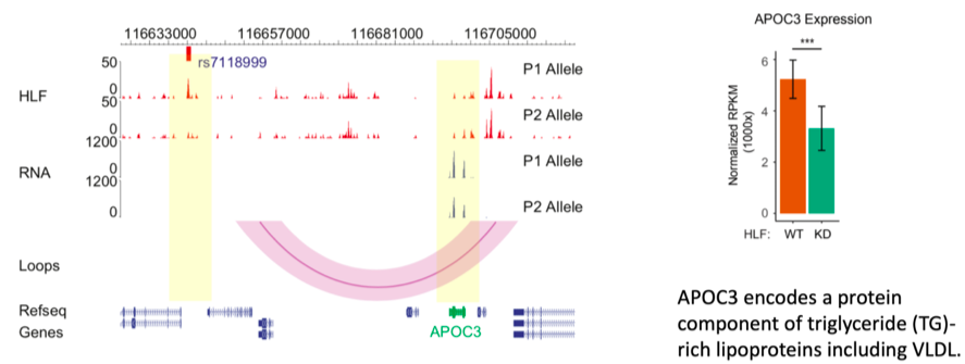左图展示了在基因组浏览器中观察到的SNP rs7118999可以影响HLF转录因子的亲和力,从而通过三维基因组折叠的方式,引起下游APOC3基因表达的差异。右图展示了在肝脏细胞中敲低HLF会导致APOC3基因表达的下降,进一步验证了该团队的科学假设。