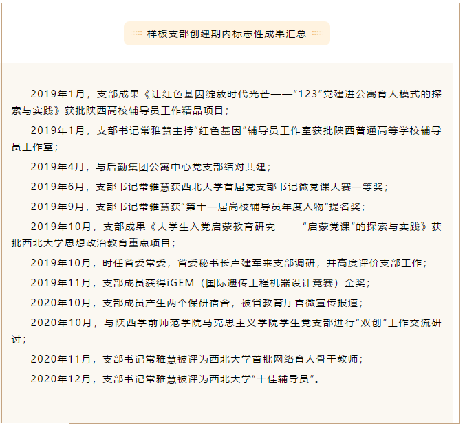 自2018年12月入选首批“全国党建工作样板支部”以来,支部围绕“七个有力”建设目标,依托省级“红色基因”辅导员工作室,坚持“以红色基因凝聚人心”的建设理念,立足大学生党建工作实际,以提升党员意识为主线,以确保党员质量为核心,以创新党员教育为重点,不断建立健全党员教育管理长效机制,形成“123”党建进公寓育人模式、“红色育人”实践学习体系、“互联网+党建”理论学习平台等工作模式,“筑梦先锋”党员服务角、“红色基因”宣讲团、红色体验营、掌上党课、党员小书包、党员政治生日、毕业生话别会等精品教育活动,成为解决大学党员教育管理现实工作难题的特色工作方法和路径,全力把“筑梦先锋”本科生党支部打造为“红色育人”的坚强阵地。