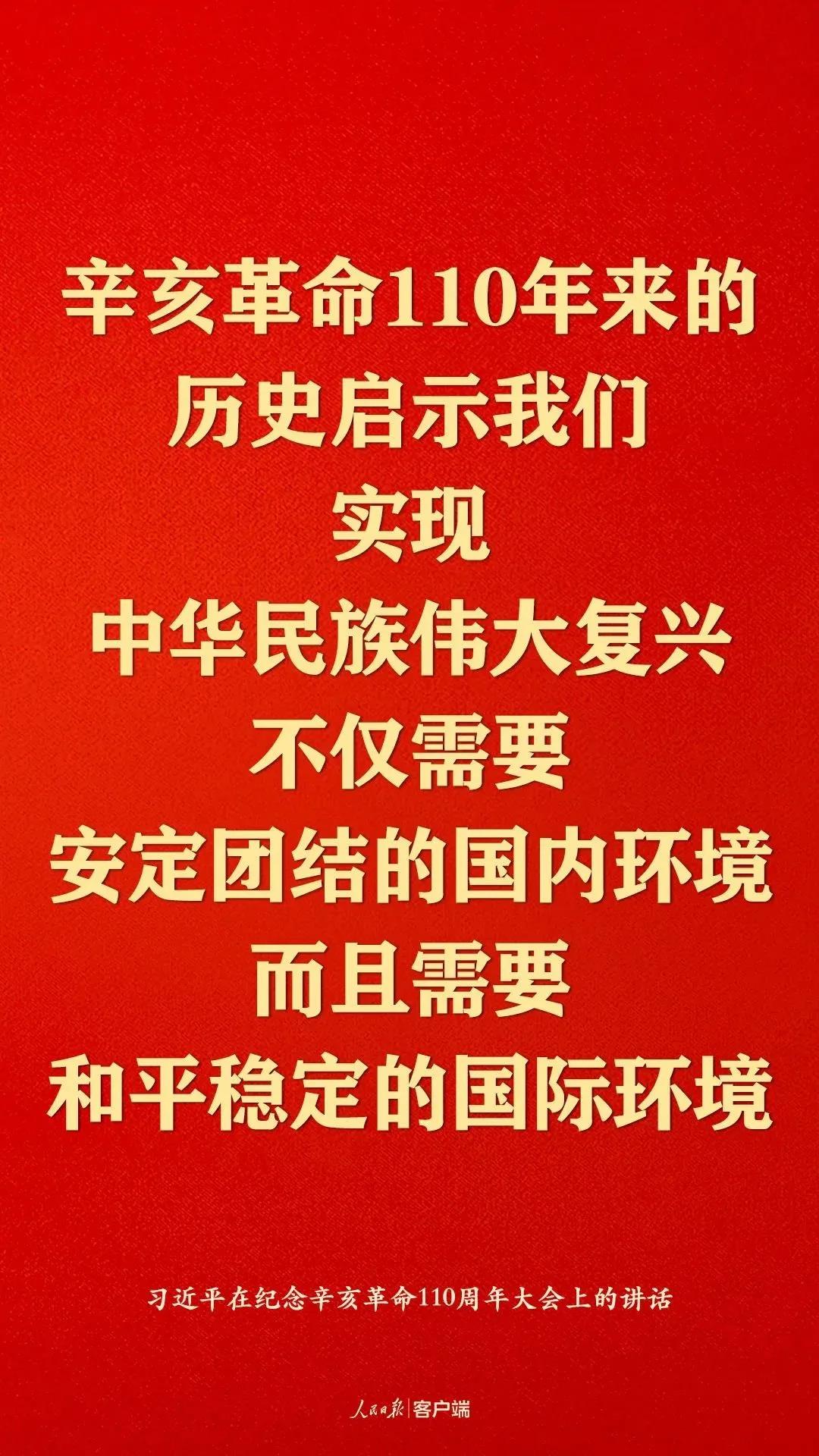 110年前爆发的辛亥革命,以其惊心动魄的时代伟力,打开了中国进步闸门,成为民族复兴伟大征程上一座巍然屹立的里程碑。今天,我们在向革命先辈致敬同时,必须以史为鉴,开创未来。特别是重温中国共产党人的爱国初心、壮志情怀和革命精神,以习近平新时代中国特色社会主义思想为引领,勤奋学习、开拓创新、团结拼搏,书写青年一代的华彩篇章。