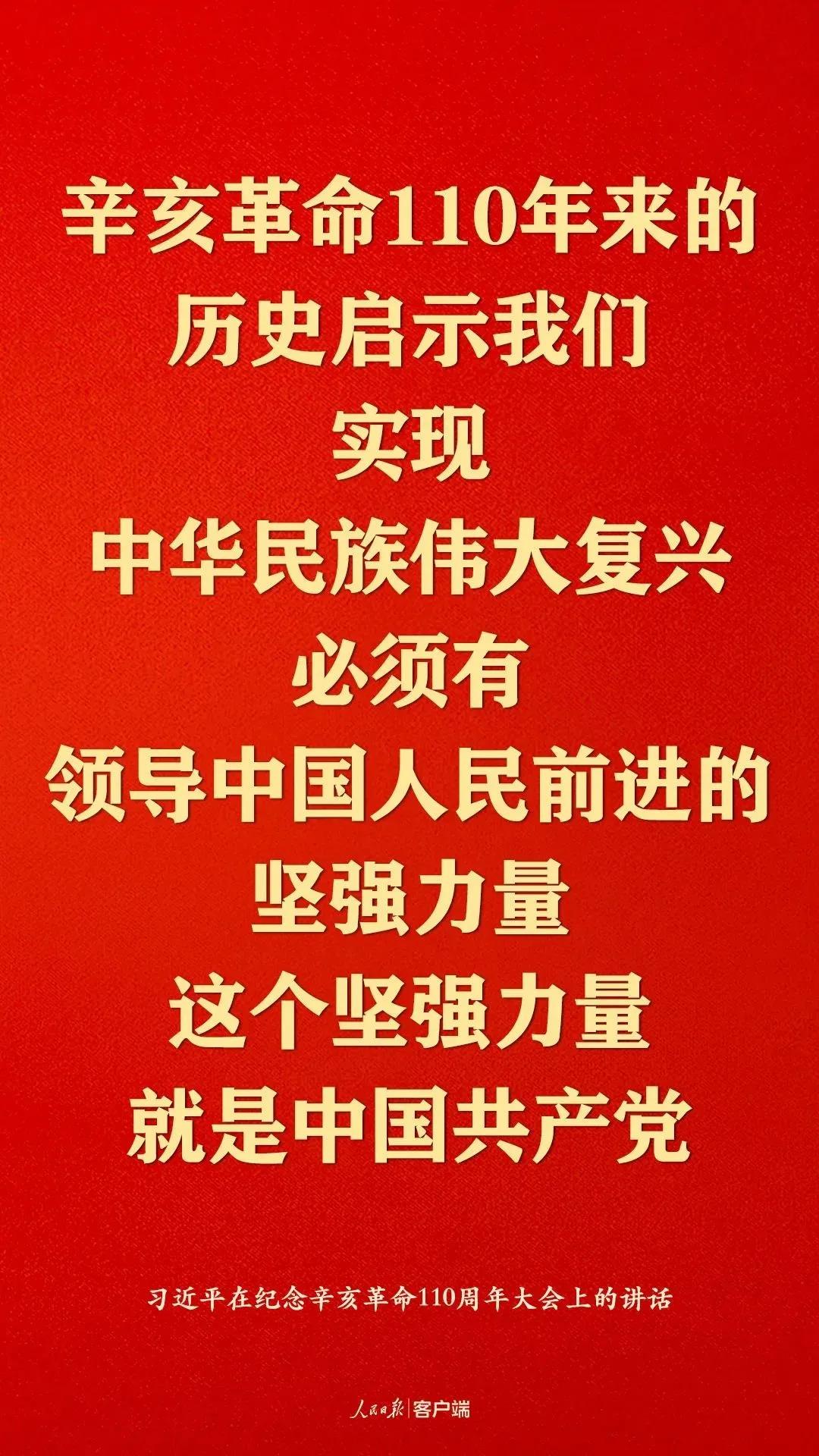 习近平总书记强调,辛亥革命110年来的历史启示我们,实现中华民族伟大复兴,必须有领导中国人民前进的坚强力量,这个坚强力量就是中国共产党。中国共产党领导是历史的选择、人民的选择,是党和国家的根本所在、命脉所在,是全国各族人民的利益所系、命运所系。没有中国共产党,就没有新中国,就没有中华民族伟大复兴。