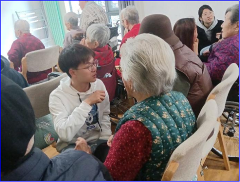 临走前,志愿者们与老人们聊起了天,仿佛和自己的爷爷奶奶聊天一样,聊着老故事,他们的家乡,爷爷奶奶们还关心志愿者的生活中困难和迷茫,用他们丰富的生活经历帮助开解志愿者们。