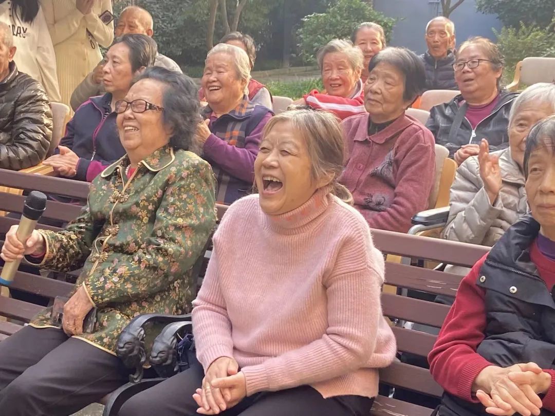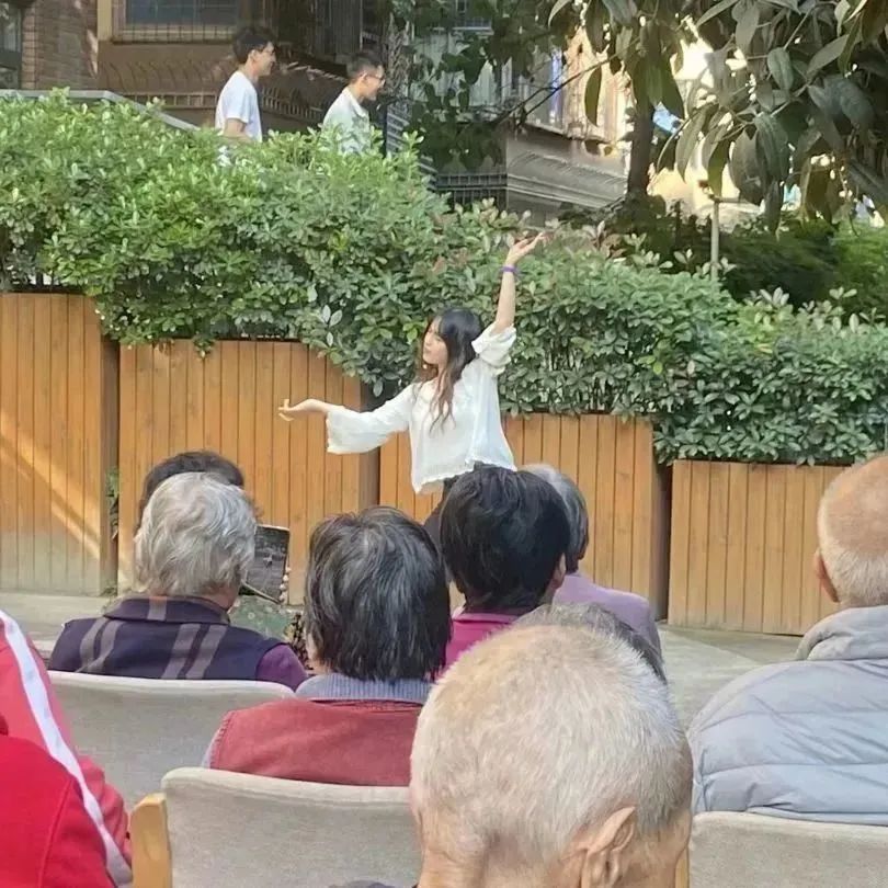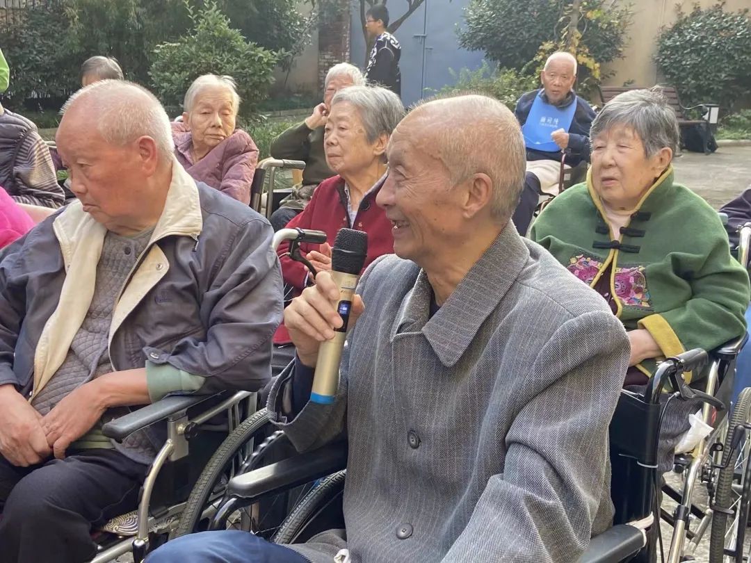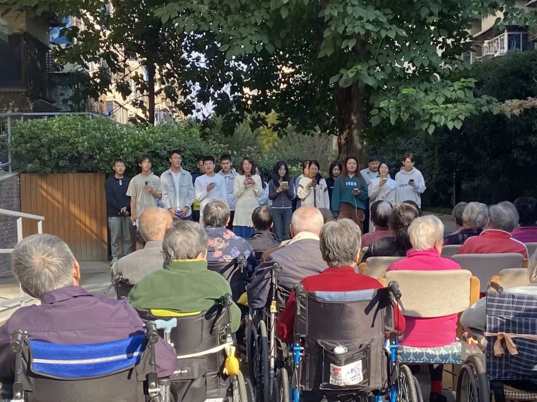 在养护院绿意盎然的院落里,同学们为老人们演唱《我和我的祖国》、《老男孩》等歌曲,老人们听得津津有味,亲切动人的歌声唤起了老人们的爱国情怀和澎湃热情,他们也像个孩子一样积极投入到表演中,与我们共同歌唱了《东方红》、《打归来》和《没有共产党就没有新中国》等歌曲。