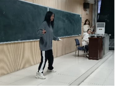 比赛开始后,负责比划的同学走上讲台查看单词,然后用肢体语言表达单词的词义,台下负责猜测的同学全神贯注,目不转睛,一旦有了思绪就会马上抢答。比赛充满着紧张刺激的气氛,无论是负责比划的同学还是负责猜测的同学,都竭尽全力,为夺取第一名的桂冠,展现了百分之百的热情和投入。