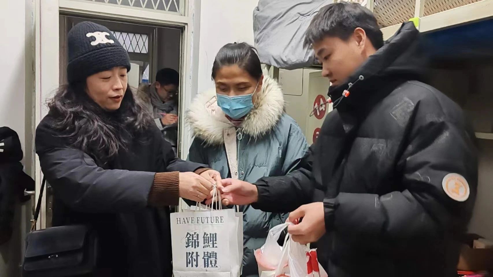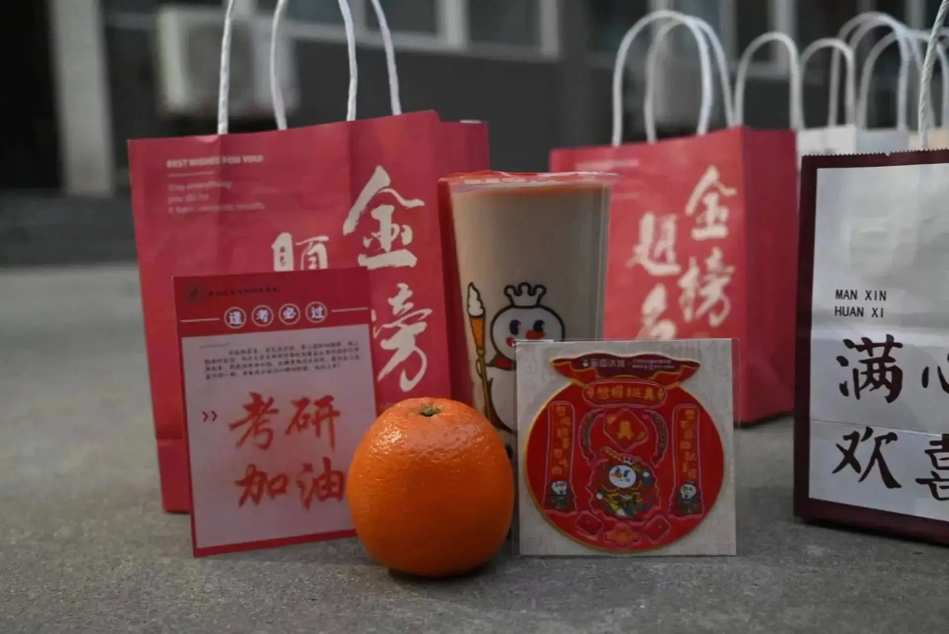虽然寒风凛凛,但这丝毫不影响我们炽热的心,学院给考研学子送祝福卡片,奶茶,苹果和橙子,寓意“苹”安喜乐,心想事“橙”。