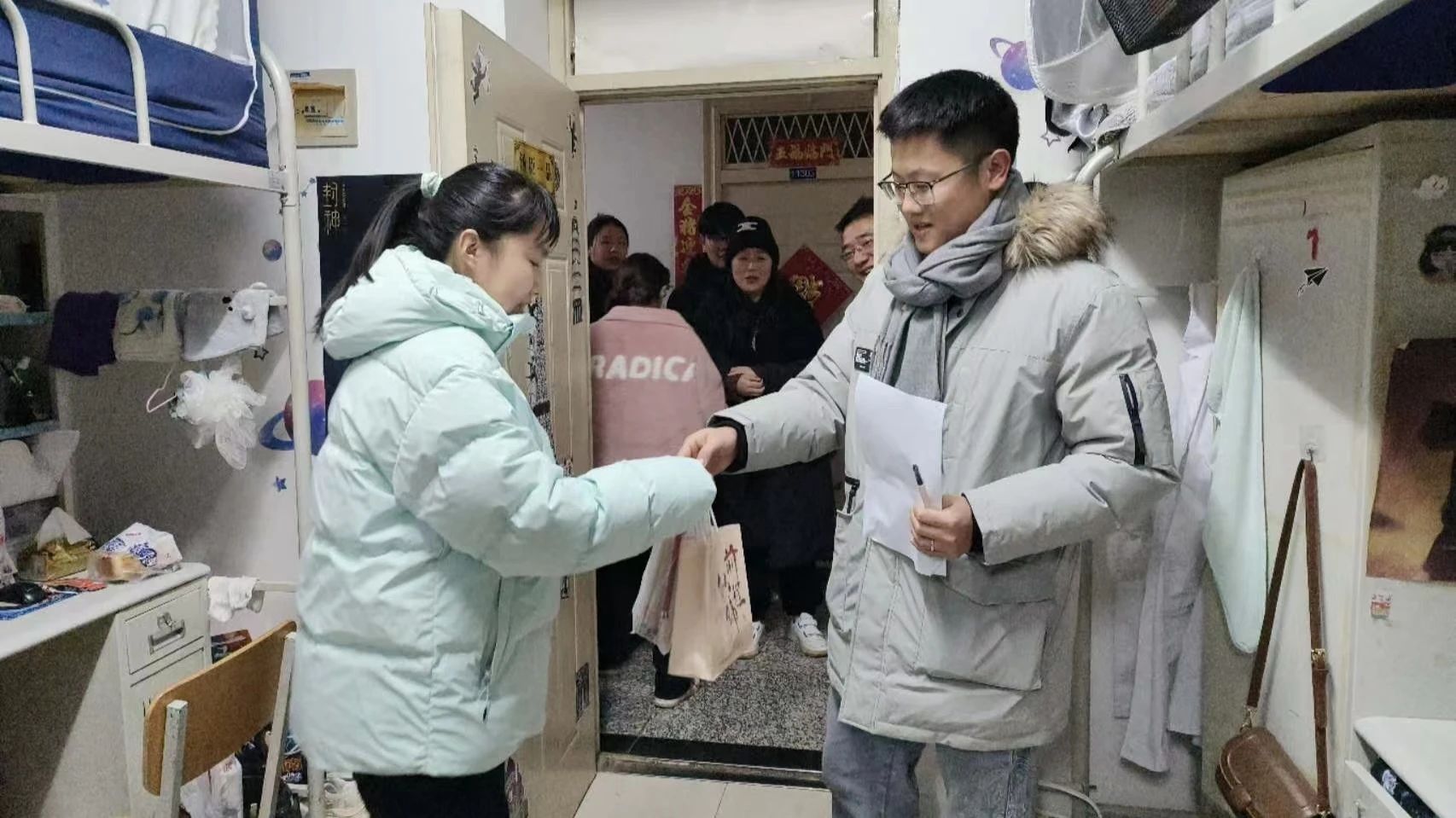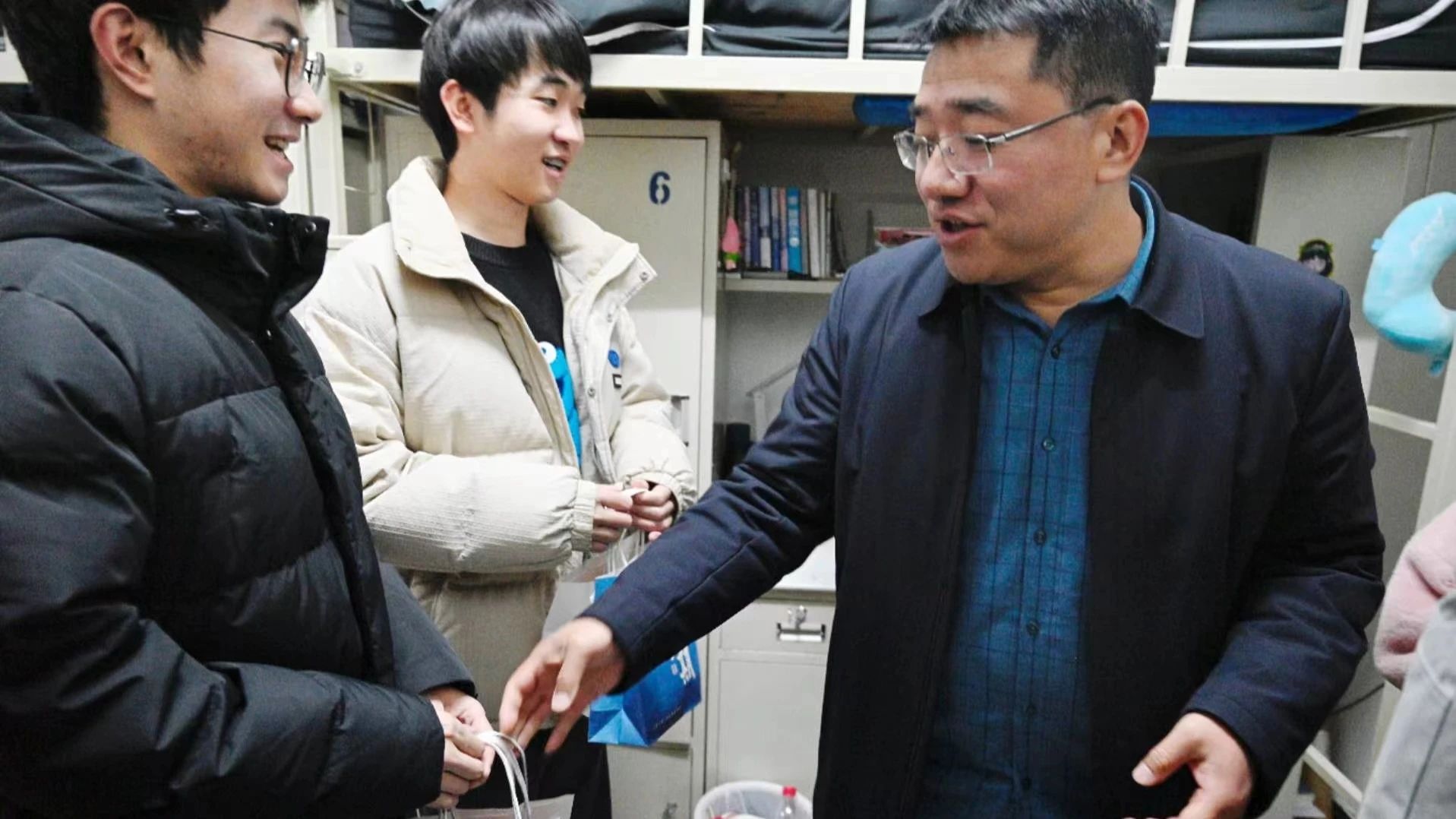 12月19日,距离考研仅剩三天,我院党委副书记魏宁老师,团委书记冯奕忠老师,毕业班班主任李贝贝老师、常惠老师、张英老师、辅导员范铭沁老师,郭佳惠老师、任洁老师来到考研同学的宿舍,为同学们送上温暖的考试祝福及关心,鼓舞士气,缓解压力。