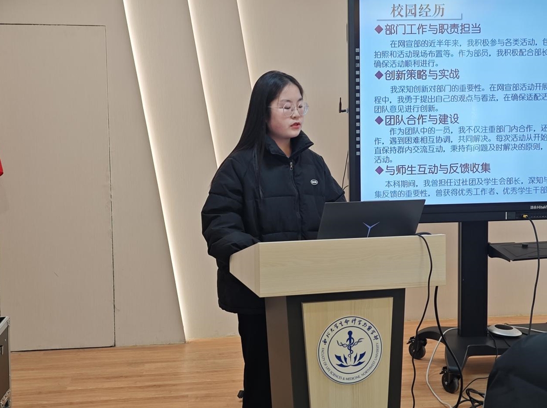 各部门学生骨干从自身特点、部门认知、工作经历以及未来工作规划等方面进行竞选演讲。竞选中,每位竞选候选人从自身角色视角出发展示了学院研究生会一学期来各项活动的精彩瞬间和取得的丰硕成果,充分展现了生科学子蓬勃向上的精神风貌。