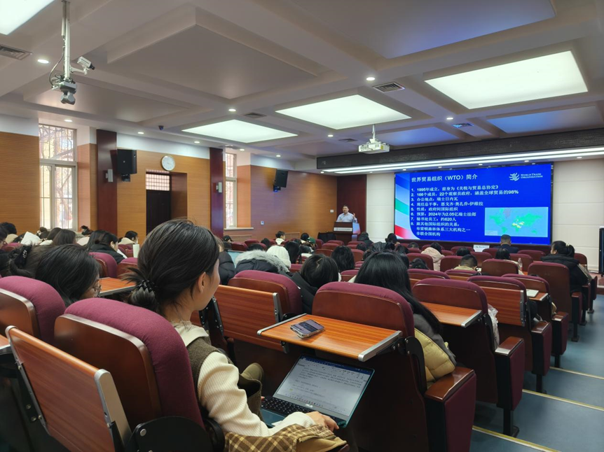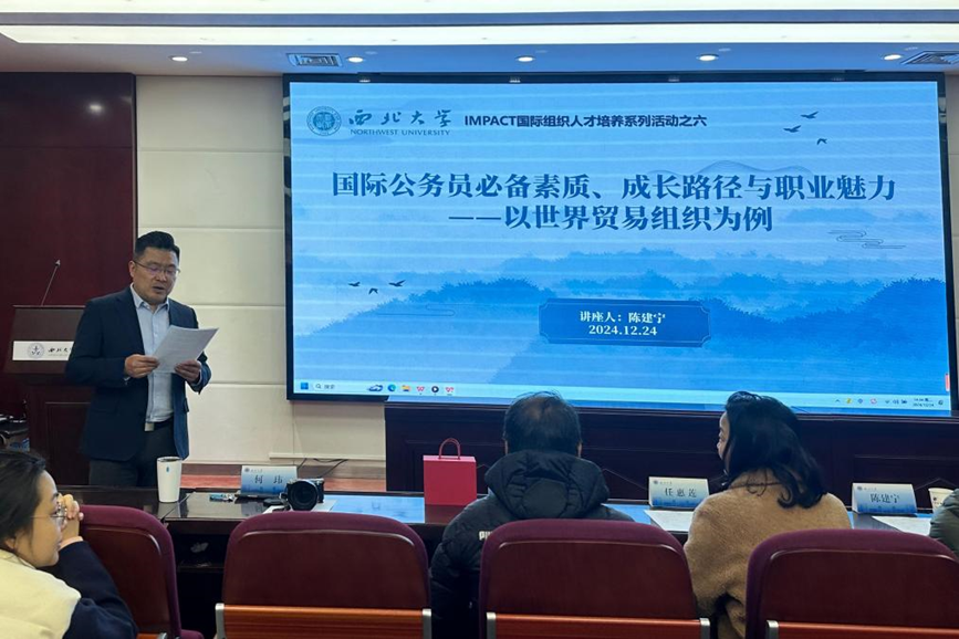 在全球化发展迅速的今天,国际合作与交流日益频繁,国际组织在维护世界和平、促进共同发展中扮演着不可或缺的角色。为响应时代需求,帮助学生拓展国际视野、提升跨文化交流能力,鼓励学生“看见世界、认识世界、走向世界”,深化其对国际组织和全球治理重要意义的认识,2024年12月24日下午,我校于太白校区博望报告厅举办第六期IMPACT 国际组织人才培养专题讲座,以“国际公务员必备素质、成长路径与职业魅力——以世界贸易组织为例”为主题,邀请世界贸易组织国际职员陈建宁先生担任主讲,校国际合作部部长任惠莲,学院党委书记刘小光、外事副院长何玮出席,近百名中外学生参与。活动由学院与国际合作部(国际交流学院)联合主办,何玮副院长主持。